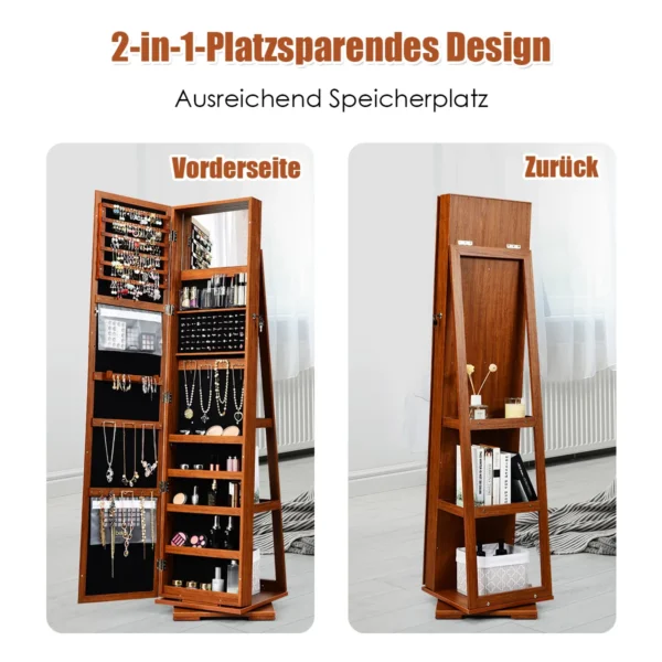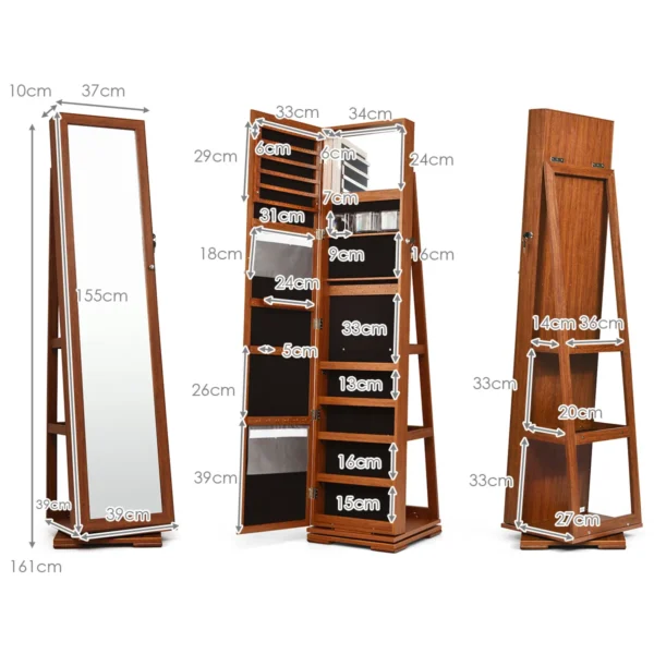 Pastatomas veidrodis-papuošalų spintelė 39x39x161cm, rudos ir juodos spalvos, skirta patogiam papuošalų ir kosmetikos laikymui. Veidrodinis paviršius leidžia matyti visą aprangą, o rakinama konstrukcija užtikrina saugumą. Dėl didelės talpos ir įvairių laikymo skyriai galite tvarkingai susidėti savo papuošalus.