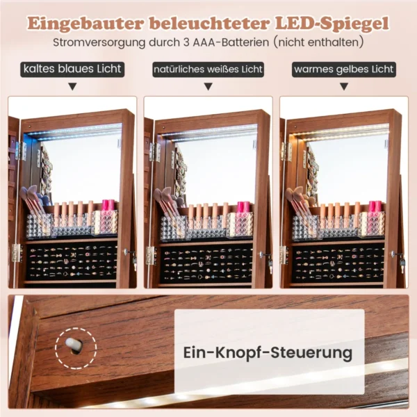 - Viena erdvi papuošalų spintelė su veidrodžiu, kabliukais ir lentynomis įvairių papuošalų laikymui.