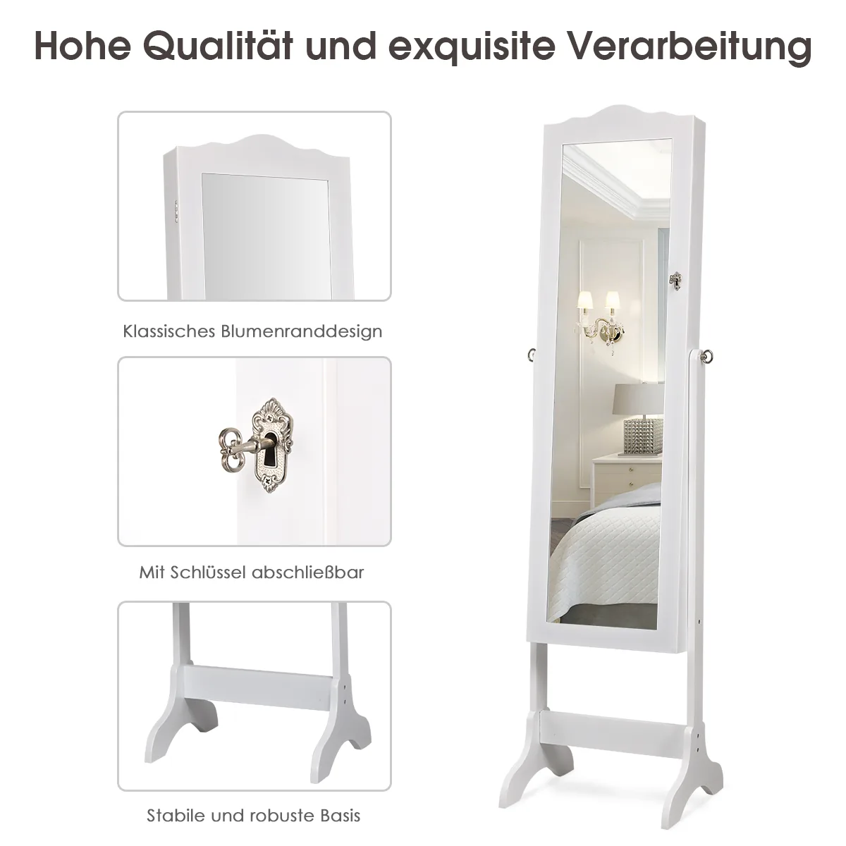 Pastatomas veidrodis-papuošalų spintelė 41,5x37x160 cm baltos ir juodos spalvos suteikia patogią saugojimo vietą papuošalams ir viso ilgio veidrodį persirengimui. Ši universali spintelė puikiai tinka miegamajam, padeda sutvarkyti papuošalus bei užtikrina patogų apsirengimo procesą.