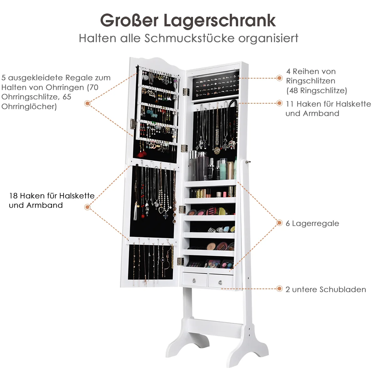 • 5 pamušaliniai skyriai auskarams, 4 žiedų angų eilės, 29 kabliukai karoliams ir apyrankėms.