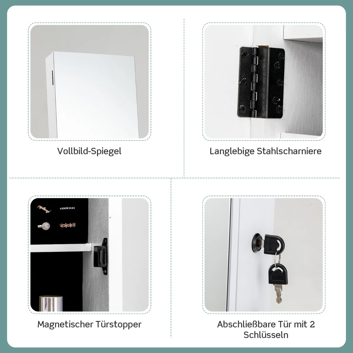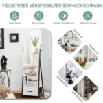 Pastatomas veidrodis-papuošalų spintelė 42x38x157 cm baltos ir juodos spalvų deriniu yra funkcionalus sprendimas papuošalų ir kosmetikos laikymui. Ši spintelė pasižymi erdviu saugojimu, viso ūgio veidrodžiu ir praktišku dizainu, tinkamu įvairiems kambariams.