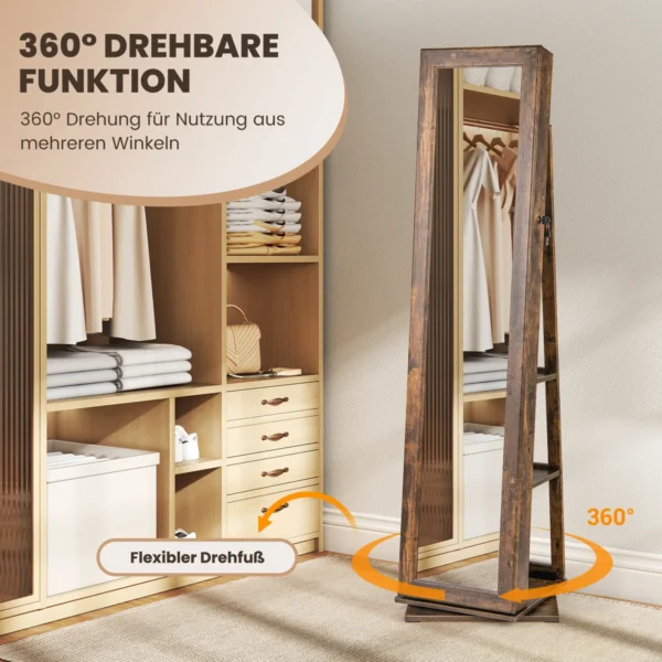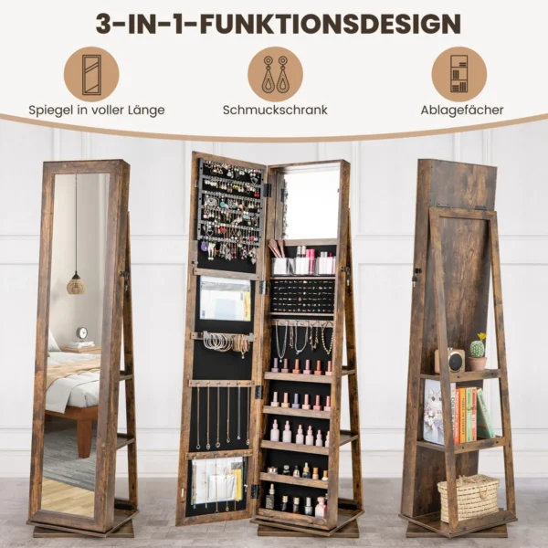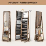 Pastatomas veidrodis-papuošalų spintelė 43x38x159cm rudos ir juodos spalvos yra praktiškas sprendimas papuošalų organizavimui ir aprangos patikrinimui. Viso ilgio veidrodis ir daug skyrelių leidžia patogiai saugoti įvairius papuošalus bei kosmetiką.