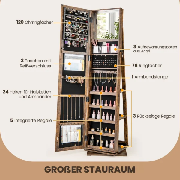 - 78 skyreliai žiedams, 5 lentynos papuošalams ir makiažui, 3 galinės lentynos daiktams.