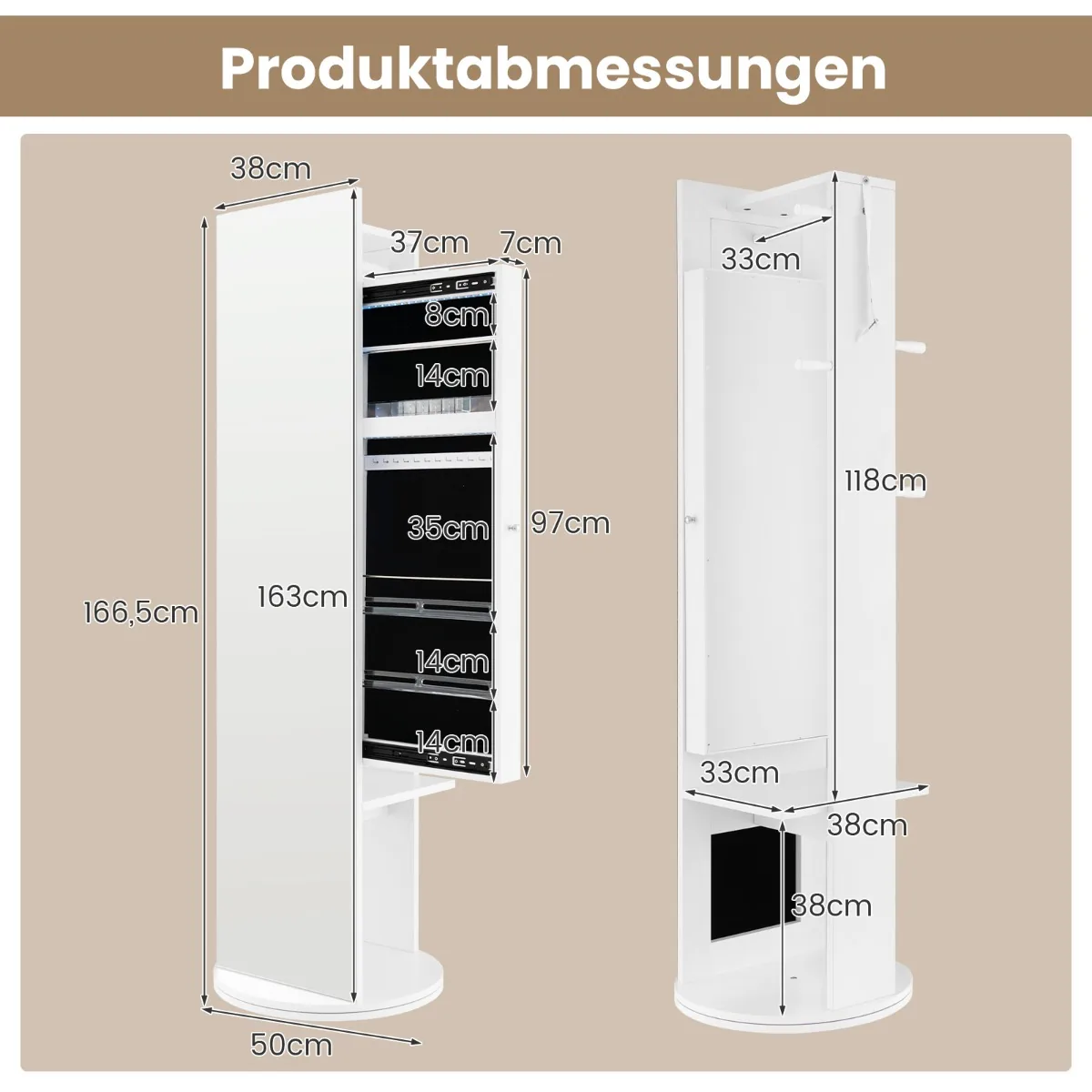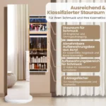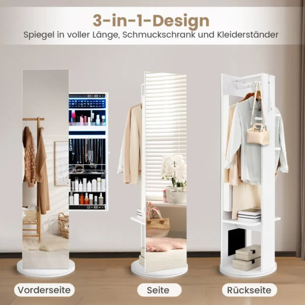 Pastatomas veidrodis-papuošalų spintelė 50x50x166,5 cm baltos ir juodos spalvos puikiai tinka erdviai papuošalų ir kosmetikos saugojimo sistemai. Šis daugiafunkcinis baldų elementas derina viso ilgio veidrodį, papuošalų spintelę ir paltų kabykla, taupydamas vietą ir užtikrindamas patogų naudojimąsi.