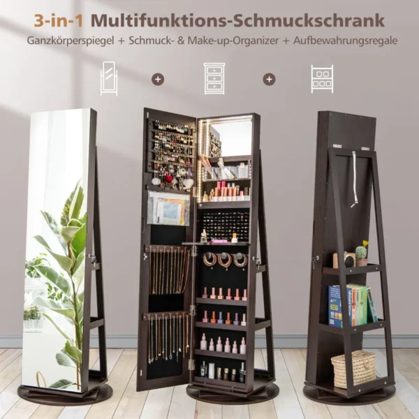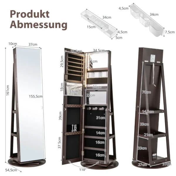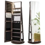 Pastatomas veidrodis-papuošalų spintelė 54,5x161cm tamsiai rudos ir juodos spalvos suteikia patogų sprendimą papuošalų laikymui ir aprangos apžiūrai. Šis daugiafunkcis baldų elementas apjungia viso ilgio veidrodį, papuošalų spintelę bei papildomas laikymo lentynas.