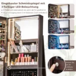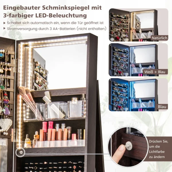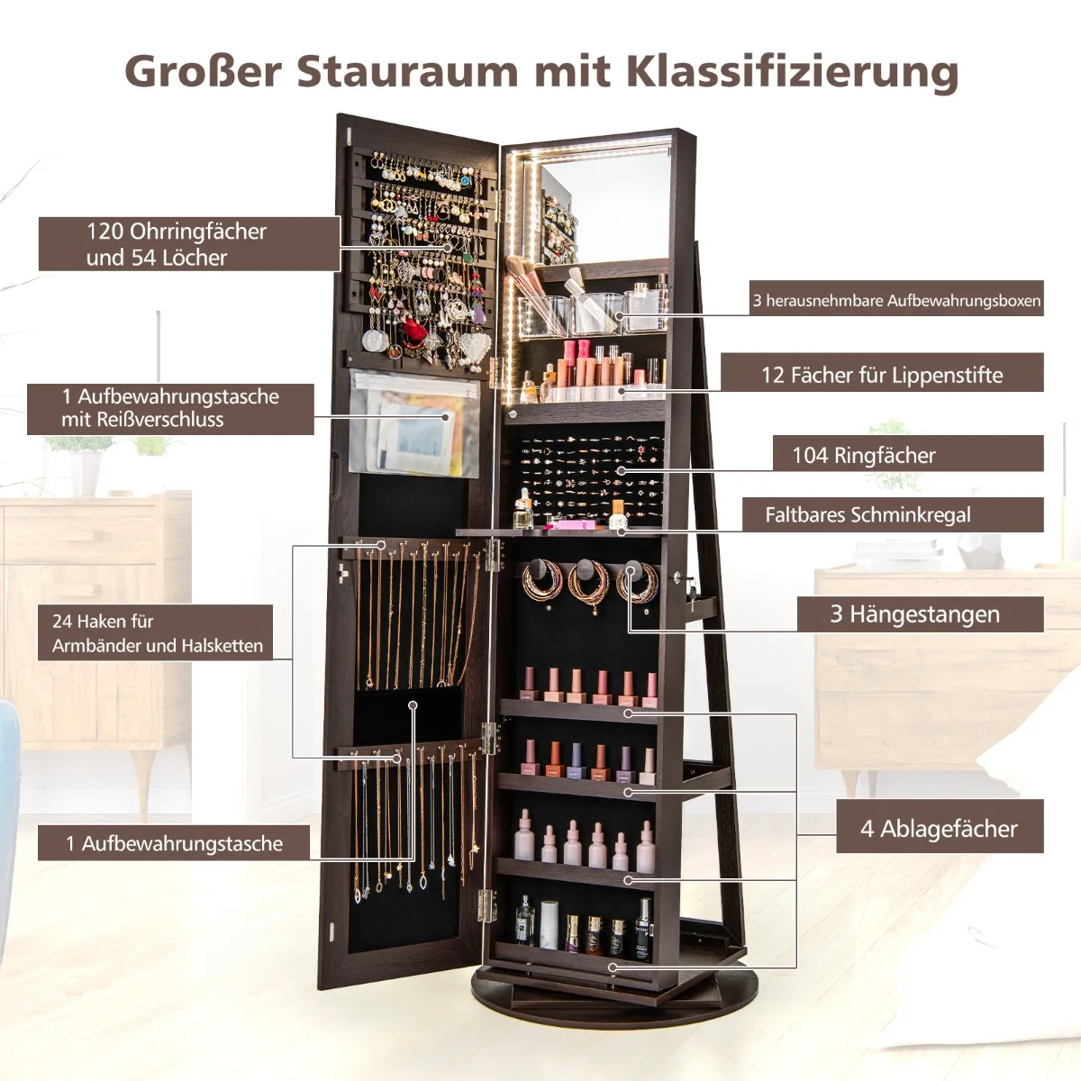 - Laisvai stovinti papuošalų spintelė su 120 auskarų angų, 24 karolių kabliukais ir 104 žiedų lizdais.