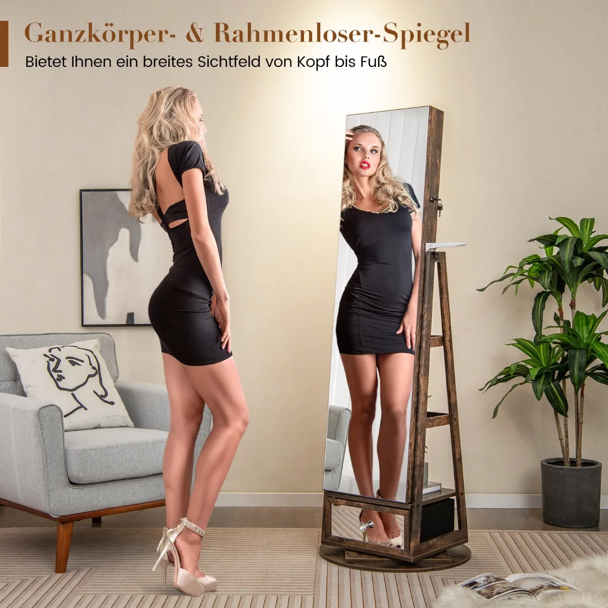 Pastatomas veidrodis-papuošalų spintelė 56×164 cm tamsiai rudos ir juodos spalvos yra funkcionali ir erdvi laikymo sistema jūsų papuošalams. Šis daugiafunkcis baldas pasižymi integruotu viso ilgio veidrodžiu ir įvairiais laikymo sprendimais, užtikrinančiais patogų ir saugų papuošalų tvarkymą.