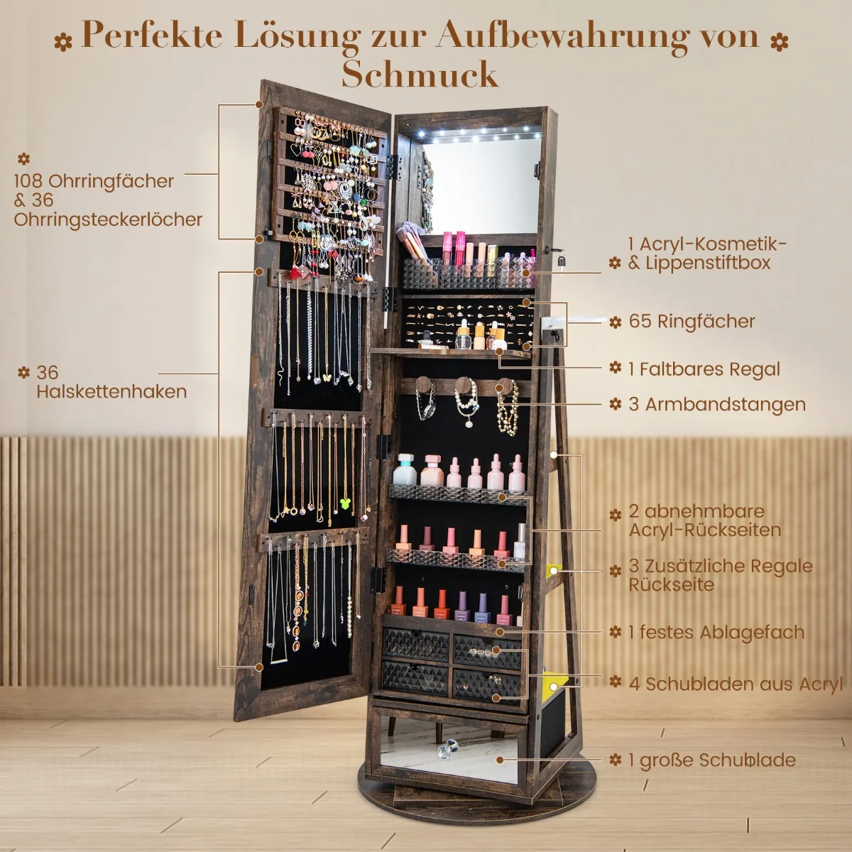 - Rakinama ir 360° besisukanti papuošalų spintelė su magnetiniu užsegimu.