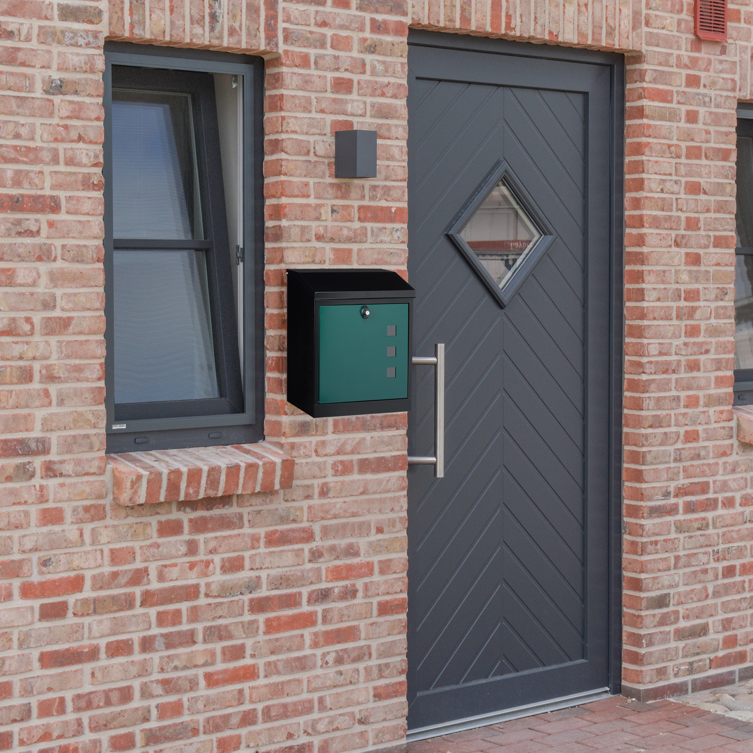 - Dizainas: Juodos ir žalios spalvos derinys suteikia dėžutei modernų ir profesionalų išvaizdą, puikiai derančią prie įvairių eksterjerų.