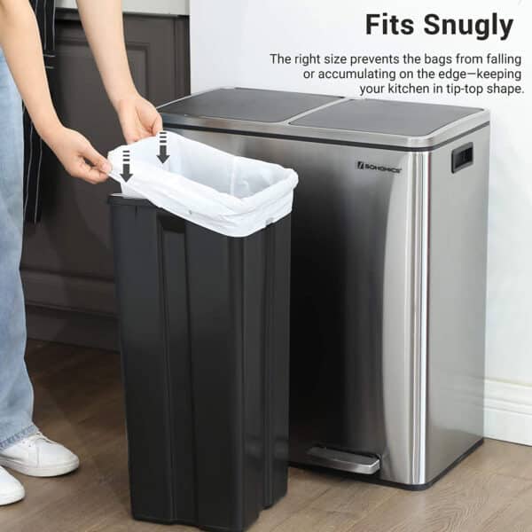 Kaip šie įdėklai palengvina virtuvės darbus? Jie skirti SONGMICS dviguboms 60L ir 30L šiukšliadėžėms ir puikiai tinka. Optimalus dydis neleidžia įdėklams išslysti arba neleidžia dangčiui užsidaryti šiukšliadėžės viršutinio krašto srityje. Praktiškos rankenos (raišteliai) padeda uždaryti šiukšlių maišus ir be problemų juos transportuoti.