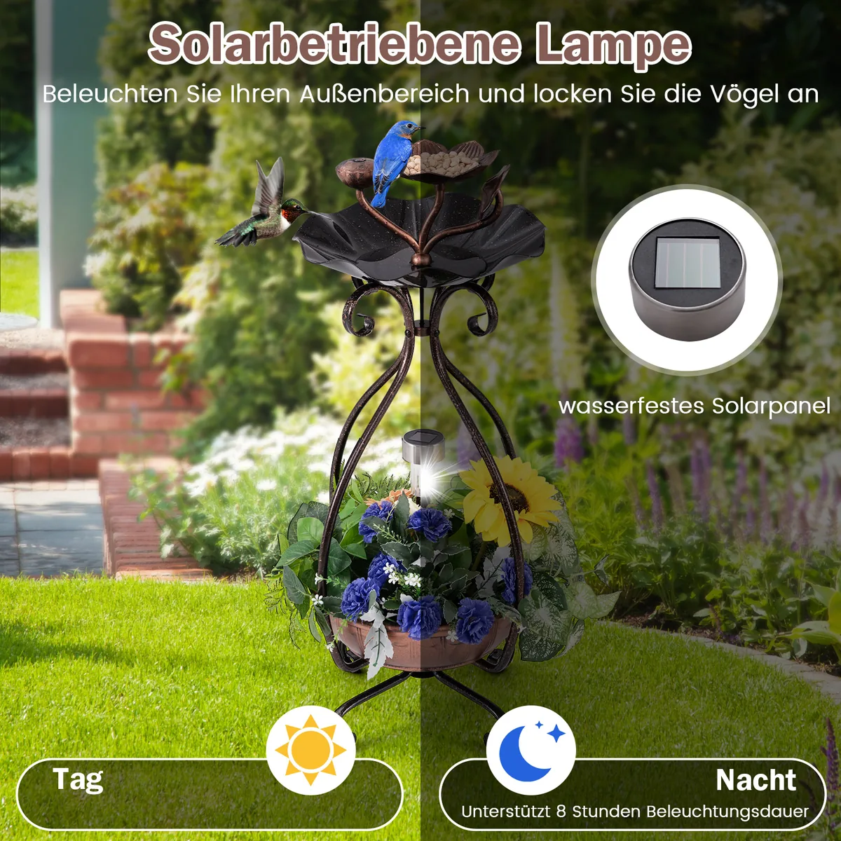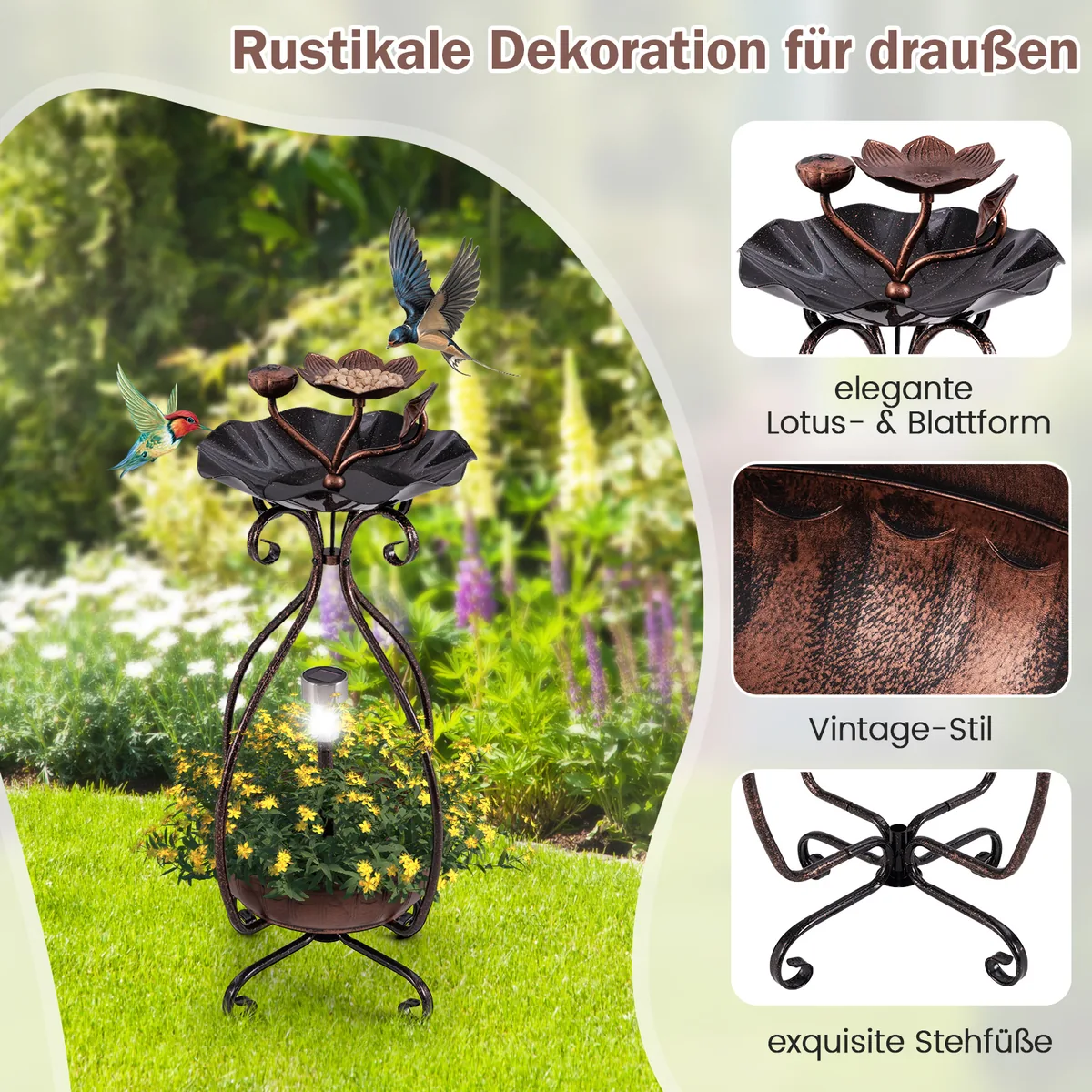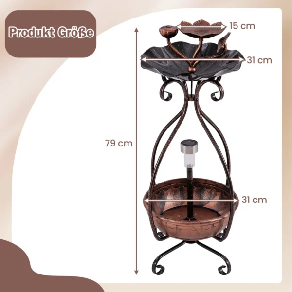 Paukščių girdykla 31x31x79cm, bronzinės spalvos, skirta lauko sodams ir kiemams. Ši metalinė paukščių vonelė su saulės baterija apšviečia aplinką iki 8 valandų ir pritraukia įvairius paukščius. Gėlių formos lesyklė ir lotoso lapų dubuo suteikia paukščiams lesinimo bei maudymosi vietą.
