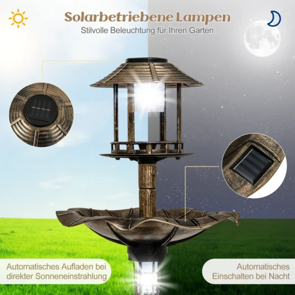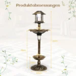 Paukščių girdykla 43x110cm bronzinės spalvos yra funkcionali ir ilgaamžė lauko paukščių vonelė bei lesyklėlė. Šis lauko aksesuaras skirtas paukščiams atsigerti, maudytis ir maitintis, o taip pat apšviečia sodą ar kiemą naktį saulės energija. Dėl tvirtos konstrukcijos ir papildomo stabilumo ji puikiai tiks įvairioms lauko sąlygoms.