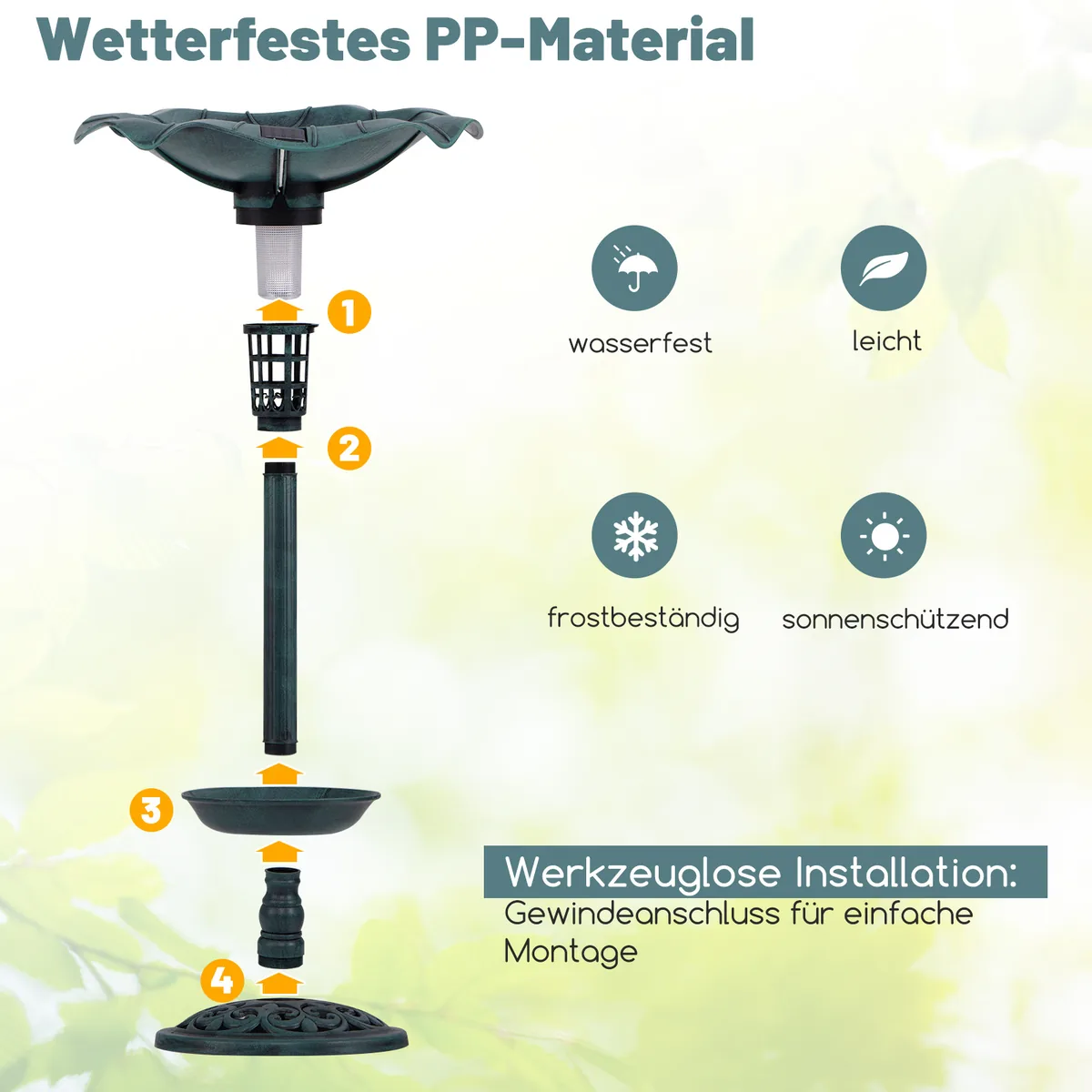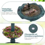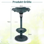 Paukščių girdykla 43x43x76cm, žalios spalvos – funkcionali lauko paukščių vonelė su integruotu saulės baterija ir LED apšvietimu, pritaikyta paukščiams maudytis, gerti ar lesinti. Atspari oro sąlygoms PP medžiaga ir papildomas gėlių sodintuvas suteikia galimybę naudoti ją įvairiomis aplinkybėmis jūsų sode ar kieme.