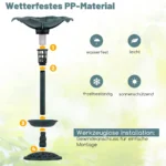 - Stovinti paukščių vonelė su saulės energija veikiančia LED lempa, kuri pritraukia paukščius ir apšviečia aplinką naktį.