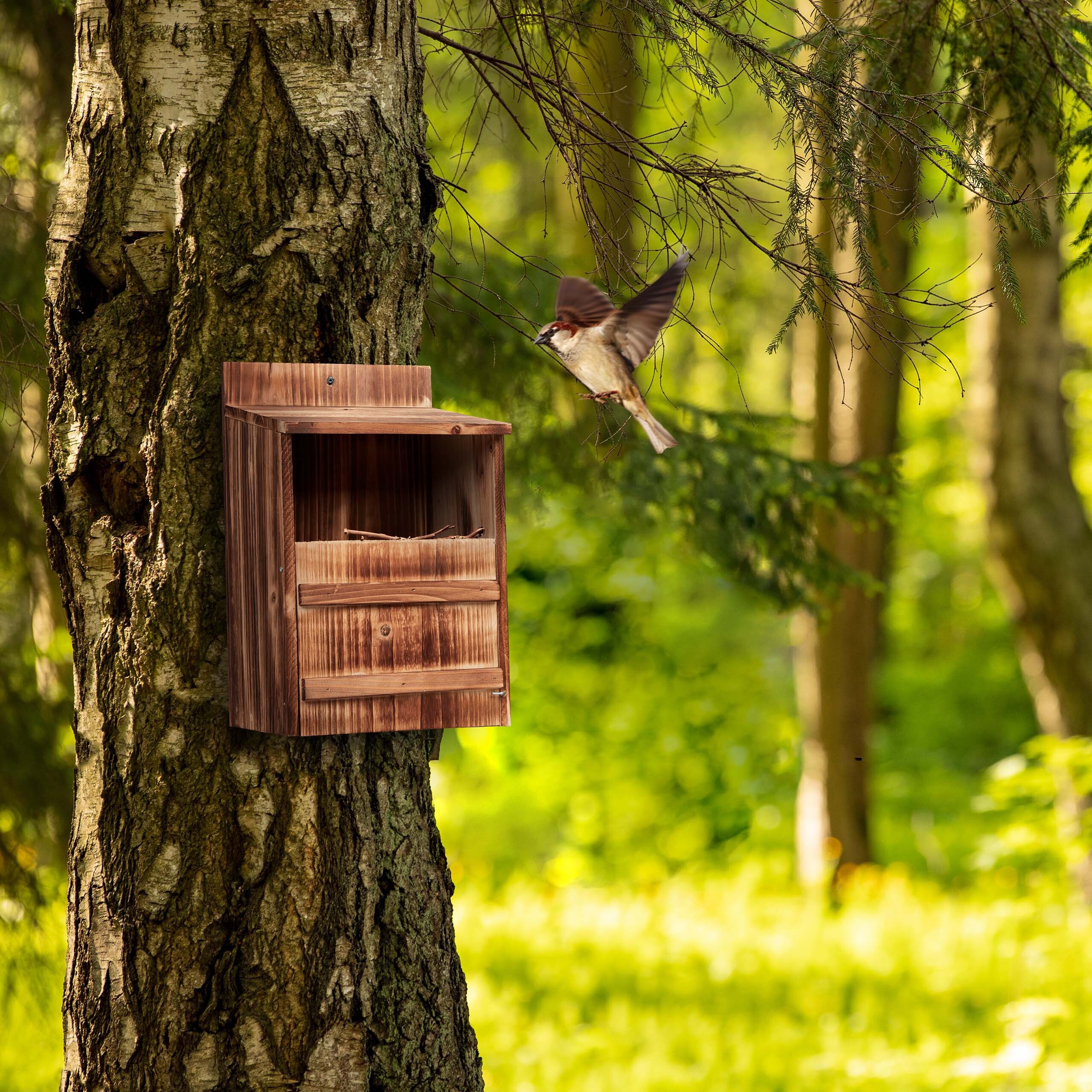 - Paprastas montavimas: Lengvai pritvirtinamas prie medžio naudojant gręžimo skylę, todėl galite greitai ir patogiai įrengti inkilą savo sode.