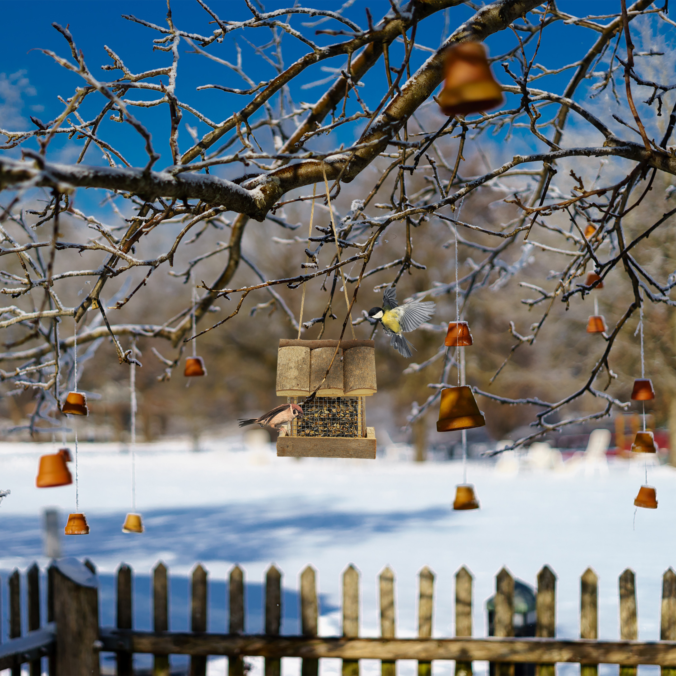 - Lengvas montavimas: Lesyklėlę galima lengvai pritvirtinti prie šakos naudojant patogią pakabą.
