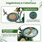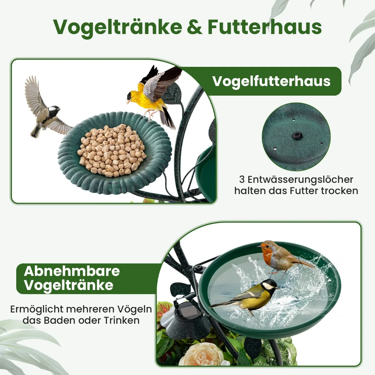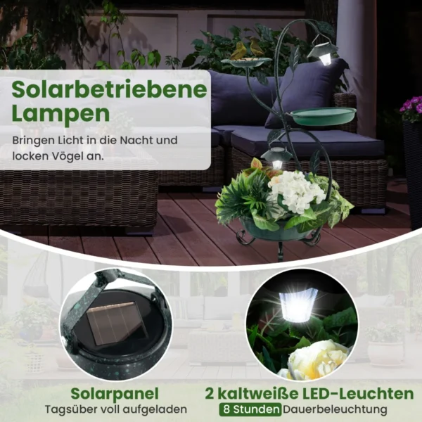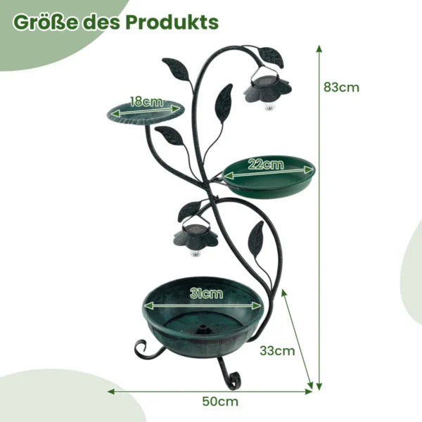 Paukščių lesyklėlė 50x33x83 cm žalios spalvos yra funkcionali ir patvari lauko paukščių prieglauda, skirta lesinti ir maudyti paukščius. Ši laisvai stovinti lesyklėlė turi saulės baterija varomą apšvietimą, kuris suteikia šviesos sodui sutemus. Lesyklėlė pagaminta iš metalinės konstrukcijos ir polipropileno, atspari oro sąlygoms.