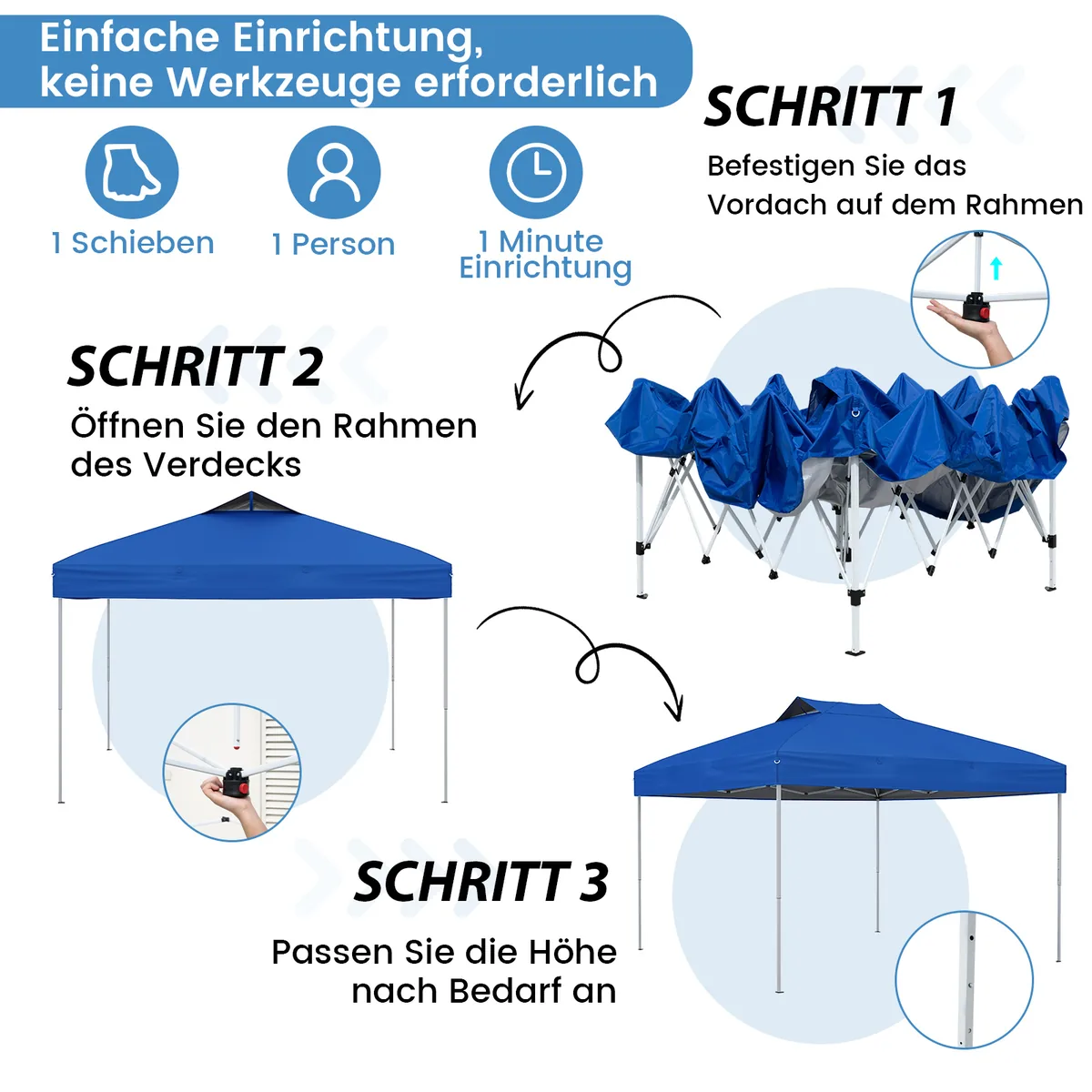 - Užrakinimo mechanizmas viena ranka leidžia greitai surinkti ir išardyti pavėsinę