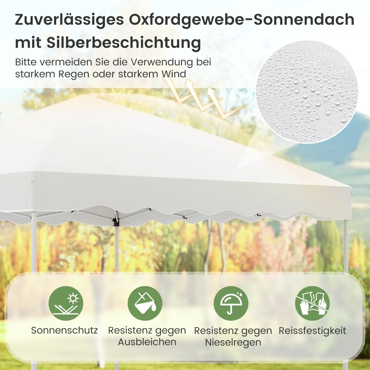 - Pagaminta iš sidabru dengto Oksfordo audinio, kuris saugo nuo saulės (UPF 50+) ir yra atsparus plyšimui bei lengvam lietui.