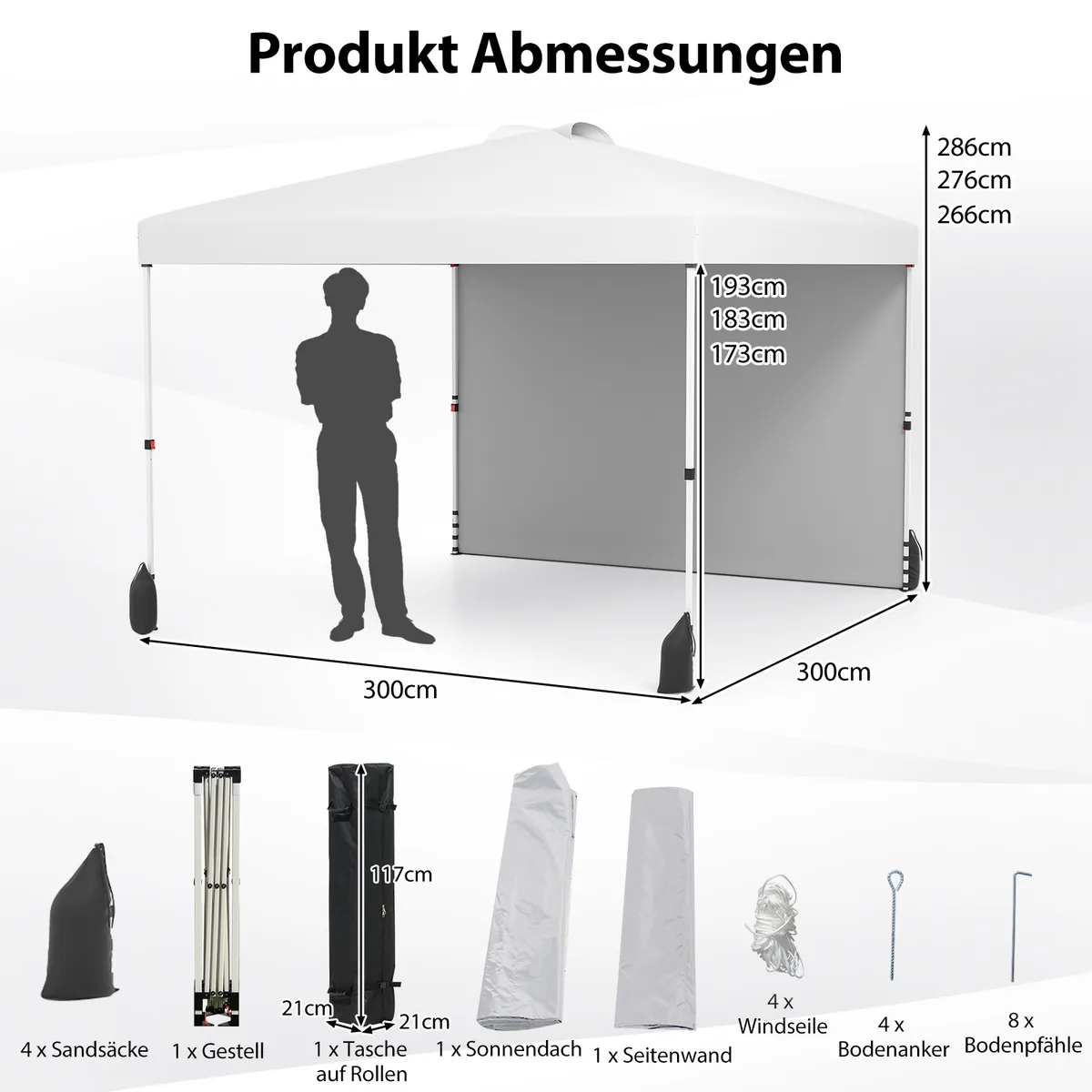 • Pavėsinės matmenys: 3 x 3 x 2,66–2,86 m (Ilgis x Plotis x Aukštis).