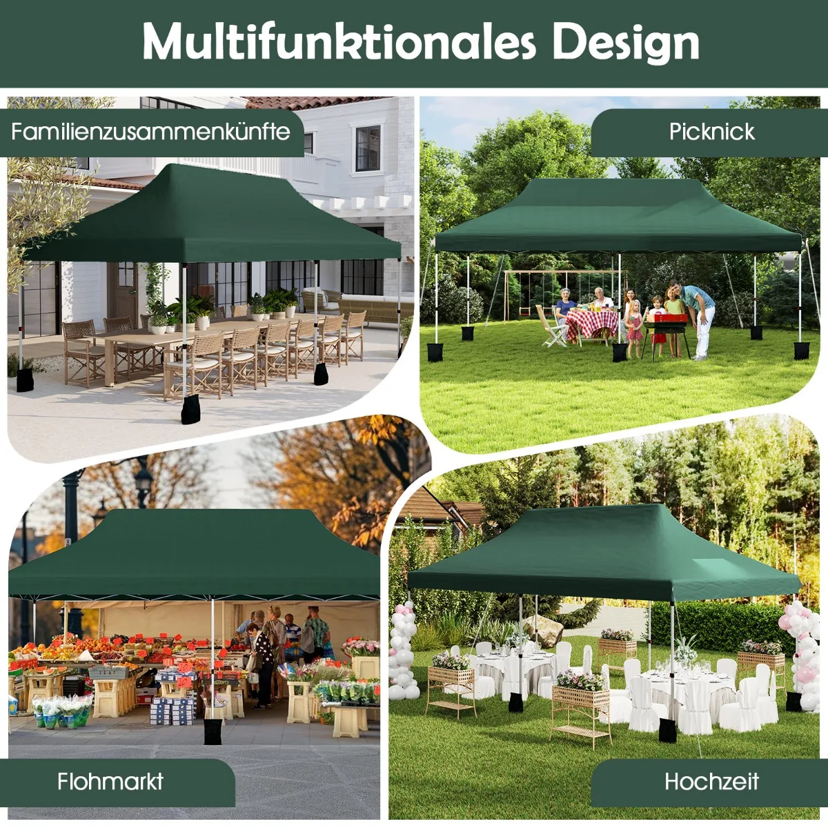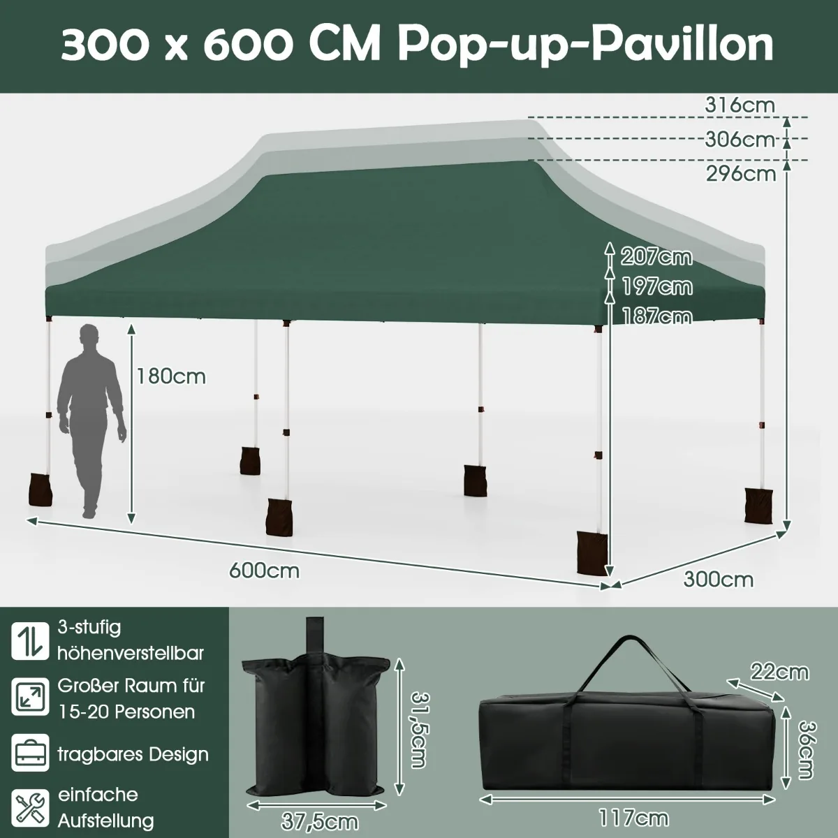Pavėsinė 300x600x316 cm, žalia spalva, skirta lauko veikloms ir renginiams. Reguliuojamo aukščio bei tvirta konstrukcija užtikrina stabilumą įvairiomis oro sąlygomis. Puikiai tinka sodo susibūrimams, stovyklavimui, vestuvėms ir kitoms lauko progoms.