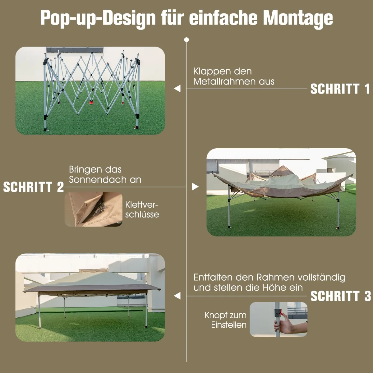 Pavėsinė 358x358x284cm, šviesiai rudos spalvos – praktiškas sprendimas lauko erdvės apsaugai nuo saulės ir lietaus. Lengvai surenkama iššokančia konstrukcija, atspari oro sąlygoms ir reguliuojamo aukščio galimybė leidžia prisitaikyti įvairioms veikloms lauke.