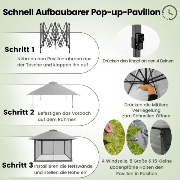 Pavėsinė 400x400x305 cm, baltos spalvos puikiai tinka įvairiems lauko renginiams, užtikrinant patogų pavėsį ir tinkamą vėdinimą. Didelis pavėsinės plotas su tinklinėmis sienomis ir ventiliuojamu stogu leidžia naudotojams mėgautis grynu oru be nepageidaujamų vabzdžių.