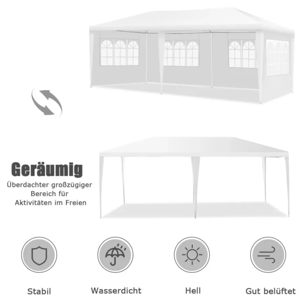 Pavėsinė 600x300x250cm, baltos spalvos – praktiškas sprendimas lauko renginiams ir poilsiui. Didelė erdvė, patikima konstrukcija bei galimybė pritaikyti pagal poreikį užtikrina patogų naudojimą įvairiomis progomis. Ši lauko palapinė skirta tiek privačiam, tiek komerciniam naudojimui.