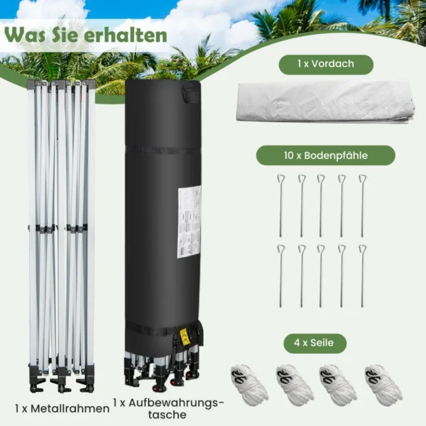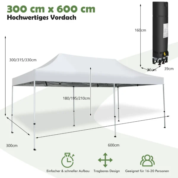 Pavėsinė 600x300x330 cm, balta, puikiai tinka lauko renginiams, terasoms ir poilsiui kieme. Didelis plotis ir keičiamas aukštis leidžia patogiai apsistoti 16-20 žmonių. Metalinis rėmas ir sidabru dengtas 300D Oxford audinys užtikrina atsparumą įvairioms oro sąlygoms.