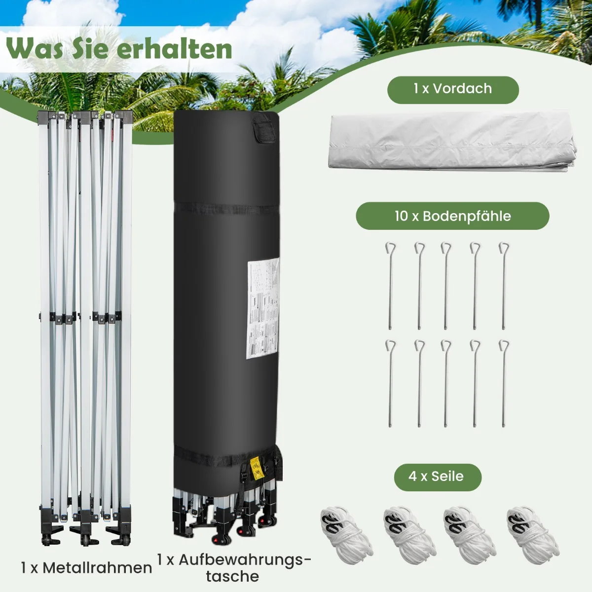 - Komplektą sudaro metaliniai kuoliukai ir virvės papildomam tvirtinimui.