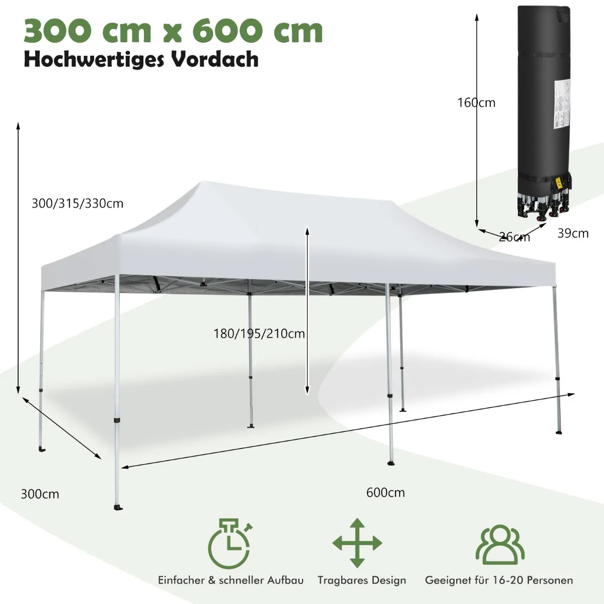 - Išskleistas dydis: 600 x 300 x 300/315/330 cm (Ilgis x Plotis x Aukštis)