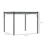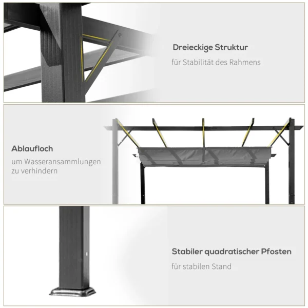 Jei norite patogiai sėdėti pavėsyje saulėtomis dienomis, mūsų Outsunny pavėsinė yra tinkamas pasirinkimas. Dėl atviros konstrukcijos mūsų pavėsinė gali būti naudojama kaip sodo paviljonas, terasos dangtis ar stogelis ir ji pakankamai apsaugo nuo tiesioginių saulės spindulių ir nedidelio lietaus. Aukštos kokybės rėmas, pagamintas iš milteliniu būdu dengto aliuminio, užtikrina stabilumą. Universalus, gerai pagamintas ir gerai apgalvotas. Vasara gali ateiti su mūsų pavėsine!