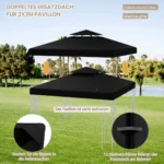 Pavėsinės stogas 300x300cm, juodos spalvos, skirtas standartinėms 3×3 metrų medinėms ir aliuminio pavėsinėms. Šis stogas užtikrina patikimą pavėsį bei apsaugą nuo saulės šviesos, lengvai pritvirtinamas ir greitai surenkamas. Tinka lauko renginiams ir kasdieniam naudojimui.