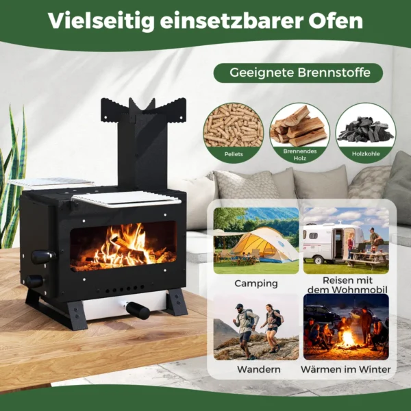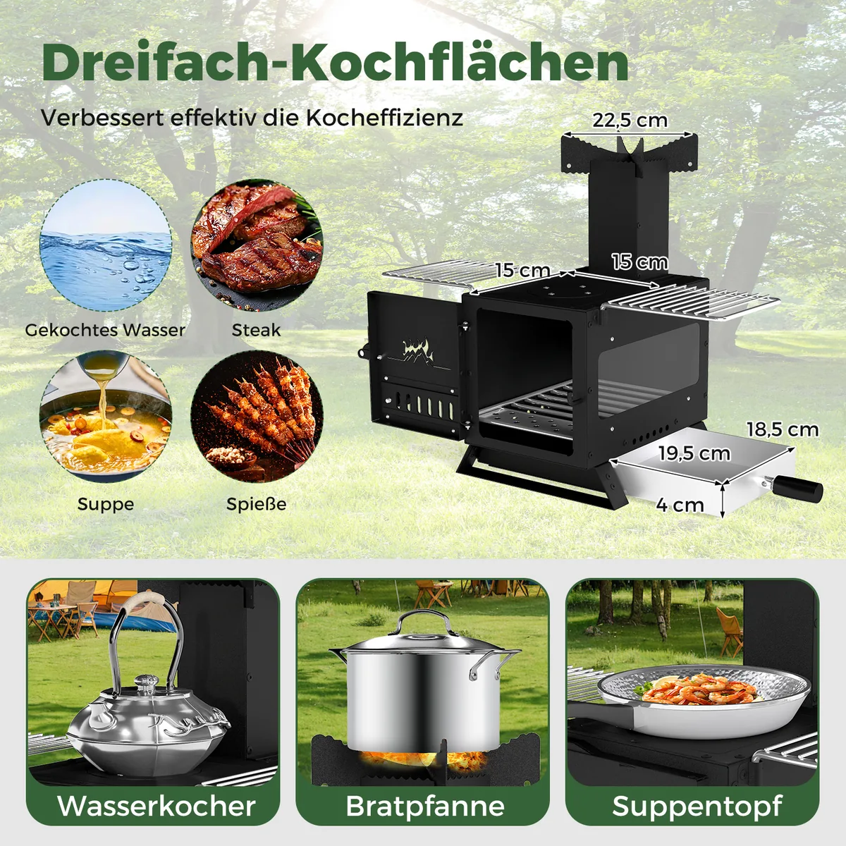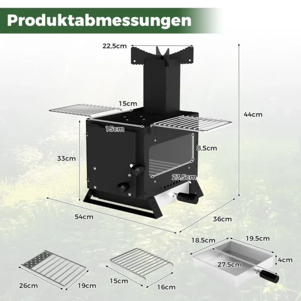 Picų krosnis 54x36x44 cm, juodos ir sidabrinės spalvos, yra kompaktiška lauko viryklė, tinkanti įvairioms kepimo ir šildymo reikmėms. Dėl trijų kaitviečių ir malkinės konstrukcijos ši krosnis ypač praktiška stovyklaujant, keliaujant ar gaminant lauke.