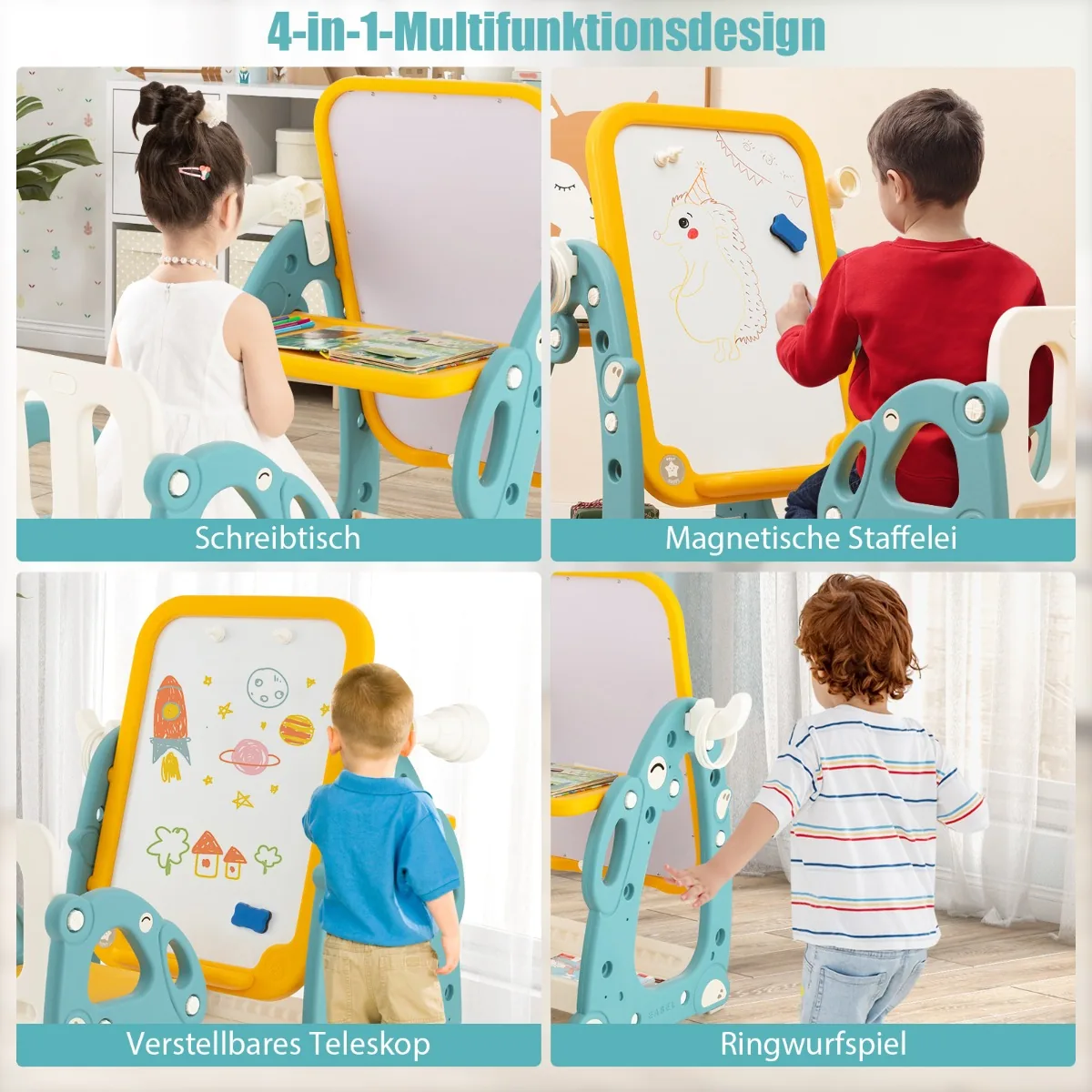 • 4-in-1 daugiafunkcinis molbertas su magnetine lente, rašomuoju stalu, teleskopu ir žiedų mėtymo žaidimu.