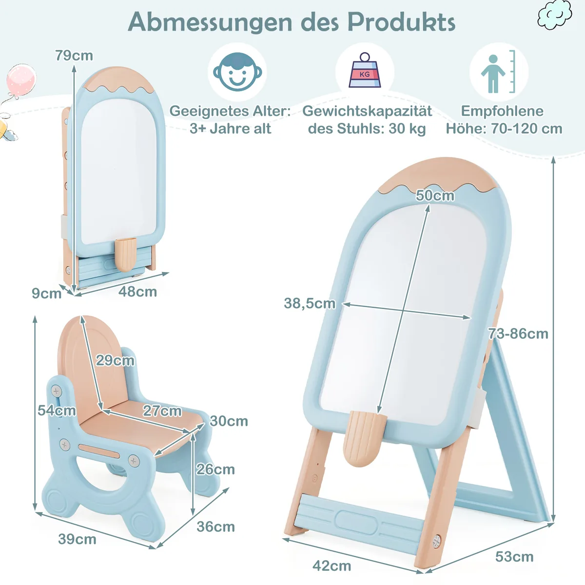 Piešimo lenta su kėdė – puikus pasirinkimas vaikų kūrybai ir mokymuisi. Reguliuojamo aukščio molbertas bei patogi kėdė skatina vaiko vaizduotę, rašymo, piešimo ir skaičiavimo įgūdžius. Dėl įvairių priedų ir saugios medžiagos tai yra funkcionali edukacinė priemonė vaikams nuo 1 metų.