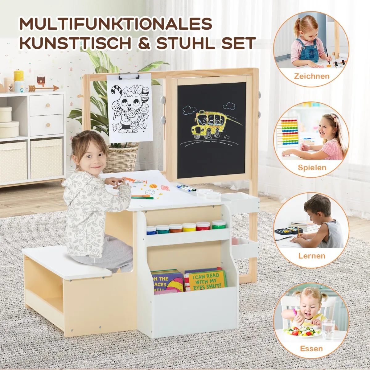 Piešimo stalas su lenta 114x81x100 cm – funkcionalus vaikų meno centras, skirtas kūrybiškam piešimui, mokymuisi ir žaidimams. Komplektas tinka vaikams nuo 3 metų, turi reguliuojamo aukščio dvipusį molbertą su magnetine ir kreidiniu lenta bei patogų suolą.