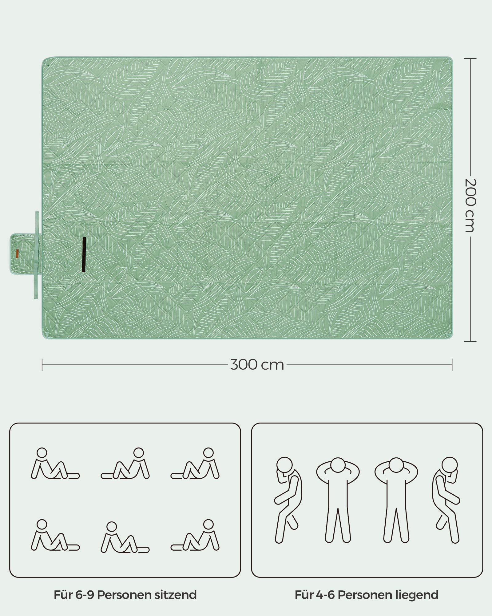 - Dydis išskleistas: 300 x 200 cm (Ilgis x Plotis) – pakankamai didelė, kad tilptų visa šeima ar draugų kompanija.