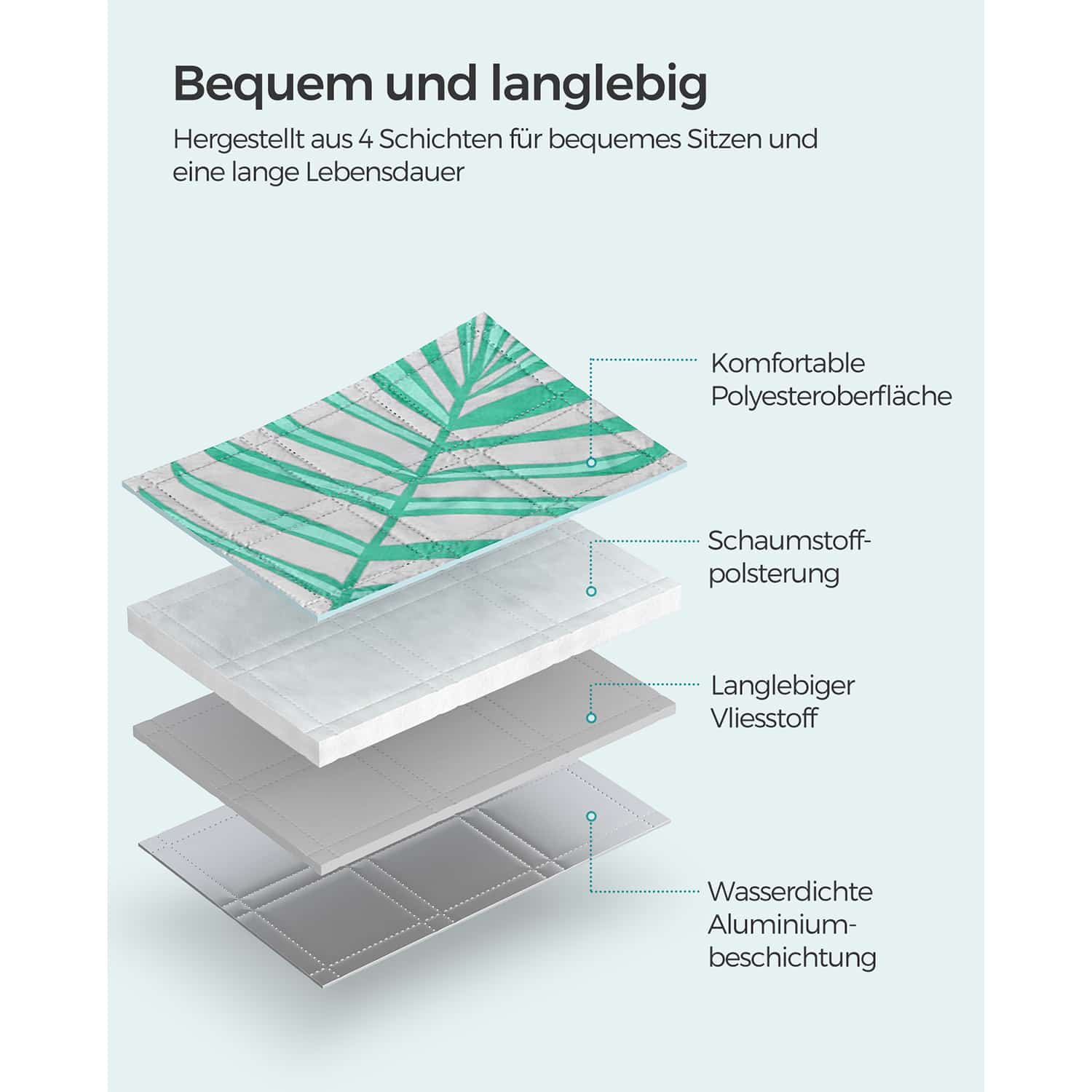 Antklodės paviršius pagamintas iš aukštos kokybės poliesterio, kuris yra patvarus ir lengvai valomas. Viduje esantis putplasčio paminkštinimas užtikrina komfortą, o neaustinis audinys ir aliuminio danga suteikia papildomą apsaugą nuo drėgmės ir purvo.