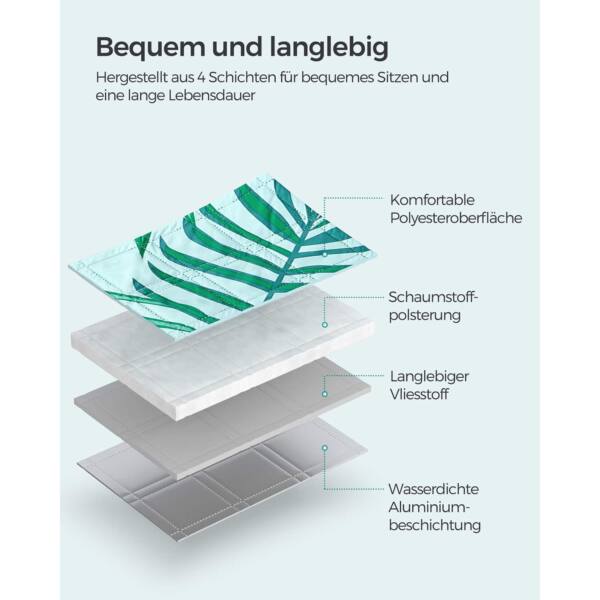 - Medžiaga: Poliesterio paviršius, putplasčio paminkštinimas, neaustinis audinys, aliuminio danga