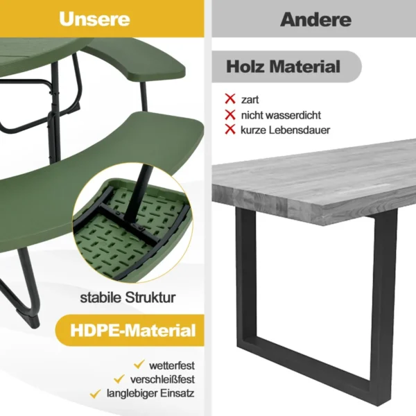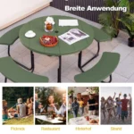 Pikniko stalas 190x76cm žalios/juodos spalvos – patvari ir praktiška lauko baldų dalis, skirta šeimos ar draugų susibūrimams. Tvirtas metalinis rėmas ir vandeniui atsparus HDPE stalviršis užtikrina ilgaamžiškumą bei stabilumą įvairiomis oro sąlygomis. Stalas su integruotu skėčio laikikliu leidžia patogiai mėgautis lauko erdve bet kokiu oru.