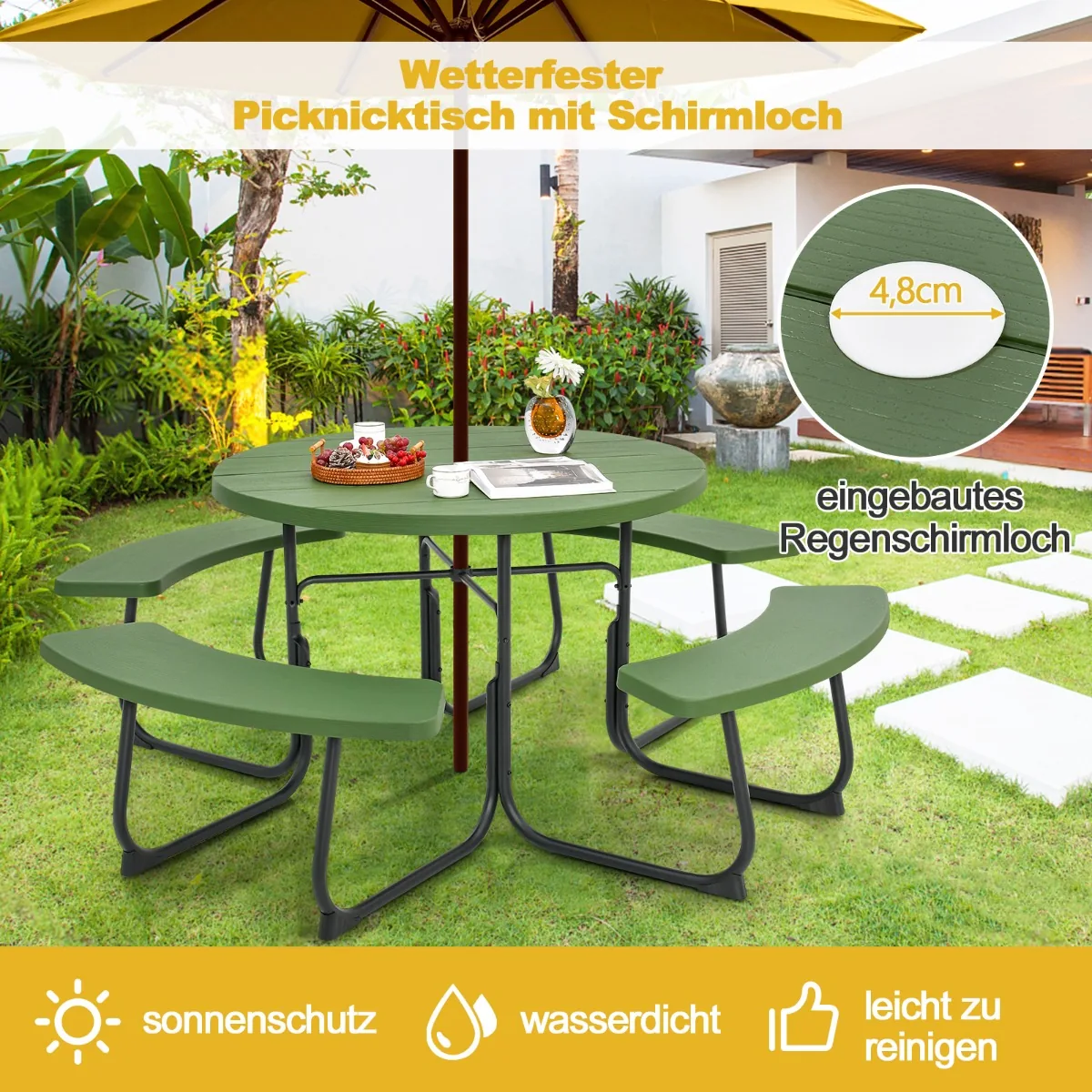 - Integruota skėčio anga su stulpo laikikliu, skirtu skėčiui iki 4,8 cm skersmens.