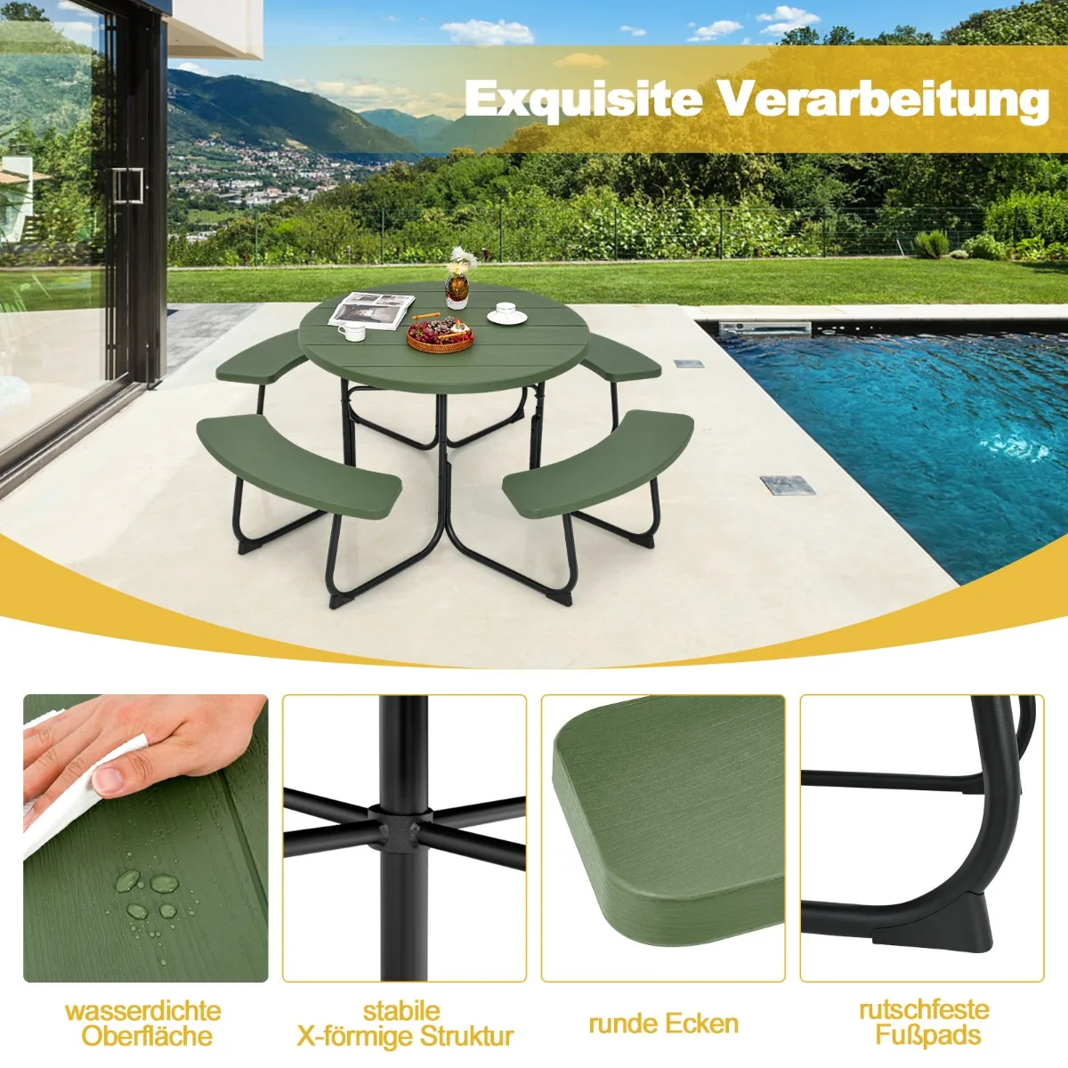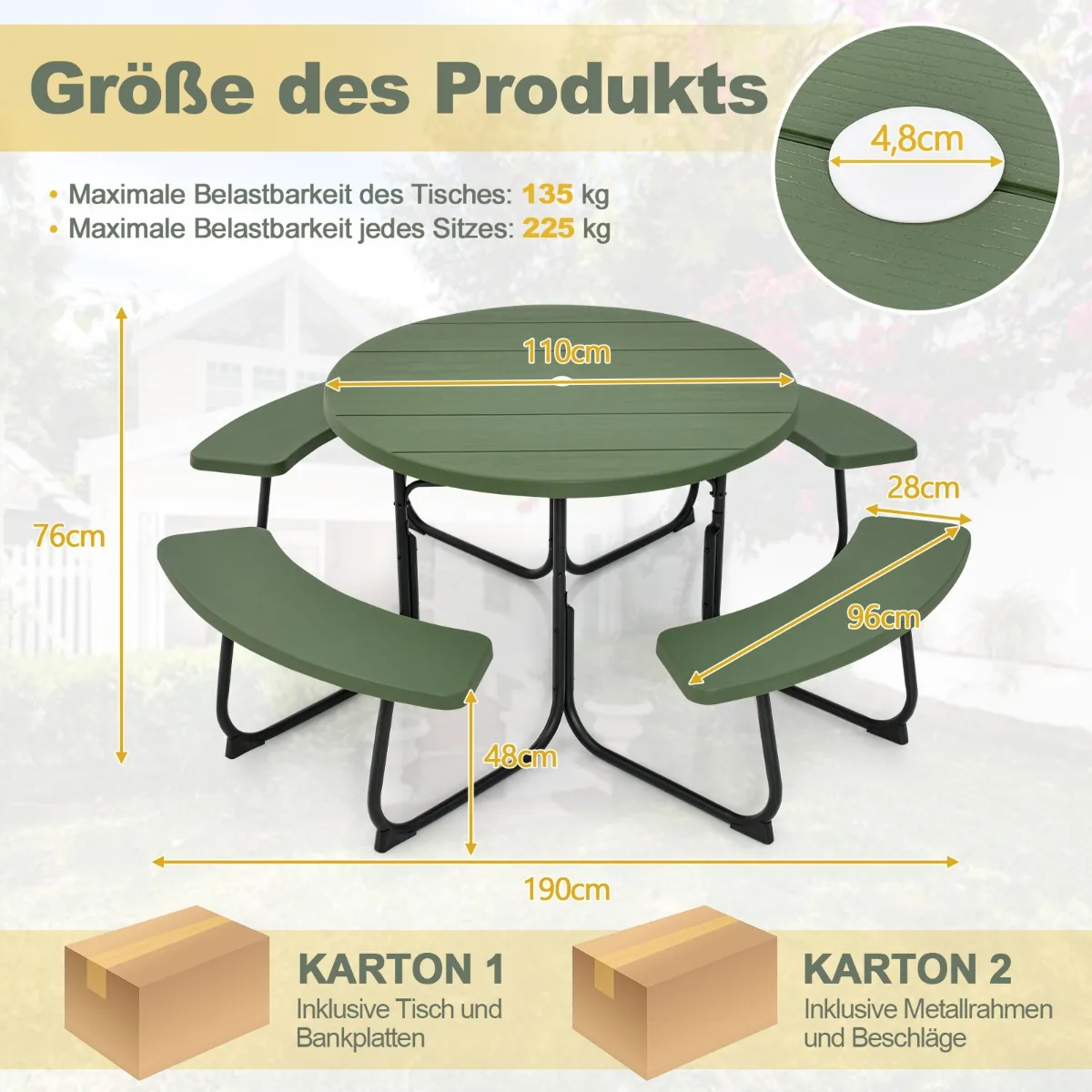 - Pikniko stalas su 4 ilgais suolais talpina iki 8 asmenų tuo pačiu metu.