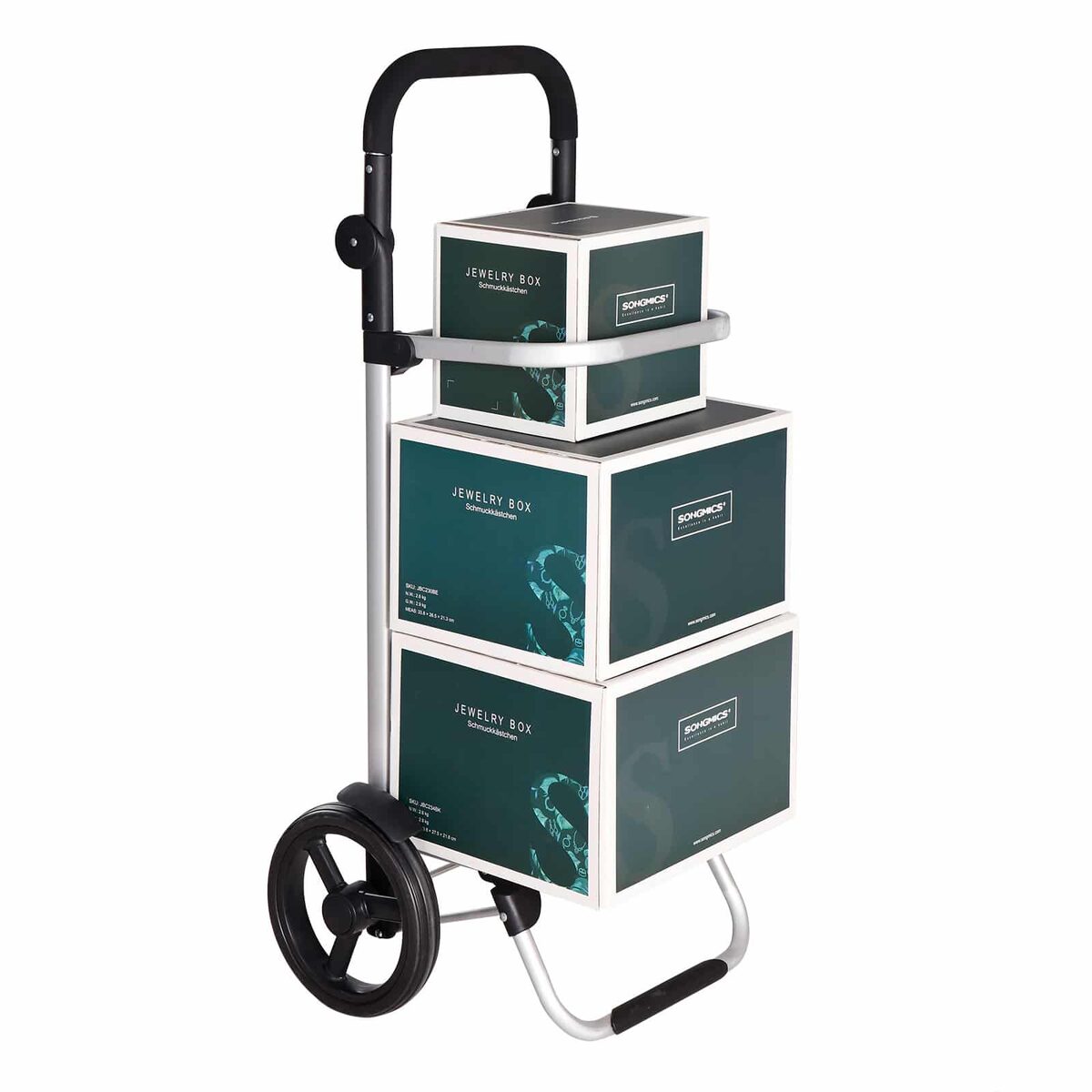 Jei visada išeinate iš prekybos centro stipriai apkrautas, pats laikas įsigyti pirkinių vežimėlį. Kuo SONGMICS pirkinių vežimėlis 40L KST04GY toks išskirtinis? SONGMICS gaminys stebina savo daugiafunkciškumu: pilką krepšį galima lengvai nuimti ir naudoti kaip stilingą pečių krepšį daiktams iki 10 kg. Vėl pritvirtintas prie aliuminio rėmo, net 25 kg galima lengvai susidėti. Sumanaus dizaino dėka vežimėlis išlieka stabilus net ir pilnai apkrovus. Krepšyje taip pat yra papildomų skyrių, kuriuose galite laikyti, pavyzdžiui, skėtį. Izoliuotas aušinimo skyrius yra ypač praktiškas. Vežimėlis taip pat gali būti pritvirtintas prie pirkinių vežimėlio 2 kabliais. Reguliuojama rankena patogiai priglunda prie riešų ir leidžia lengviau perkelti vežimėlį. Atšvaitai užtikrina saugumą kelyje. Paprastas surinkimas dėka Velcro. Gavus pakuotę, belieka atidaryti vežimėlio rėmą ir pritvirtinti ratus bei krepšį. Akumuliatorinis atsuktuvas nėra būtinas, nes ratus galima pritvirtinti „spragtelėjimu”, o maišelį su Velcro užsegimais.