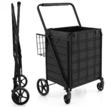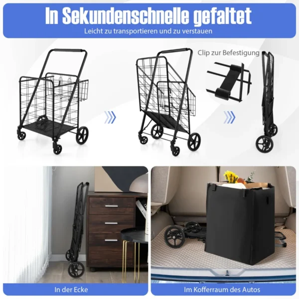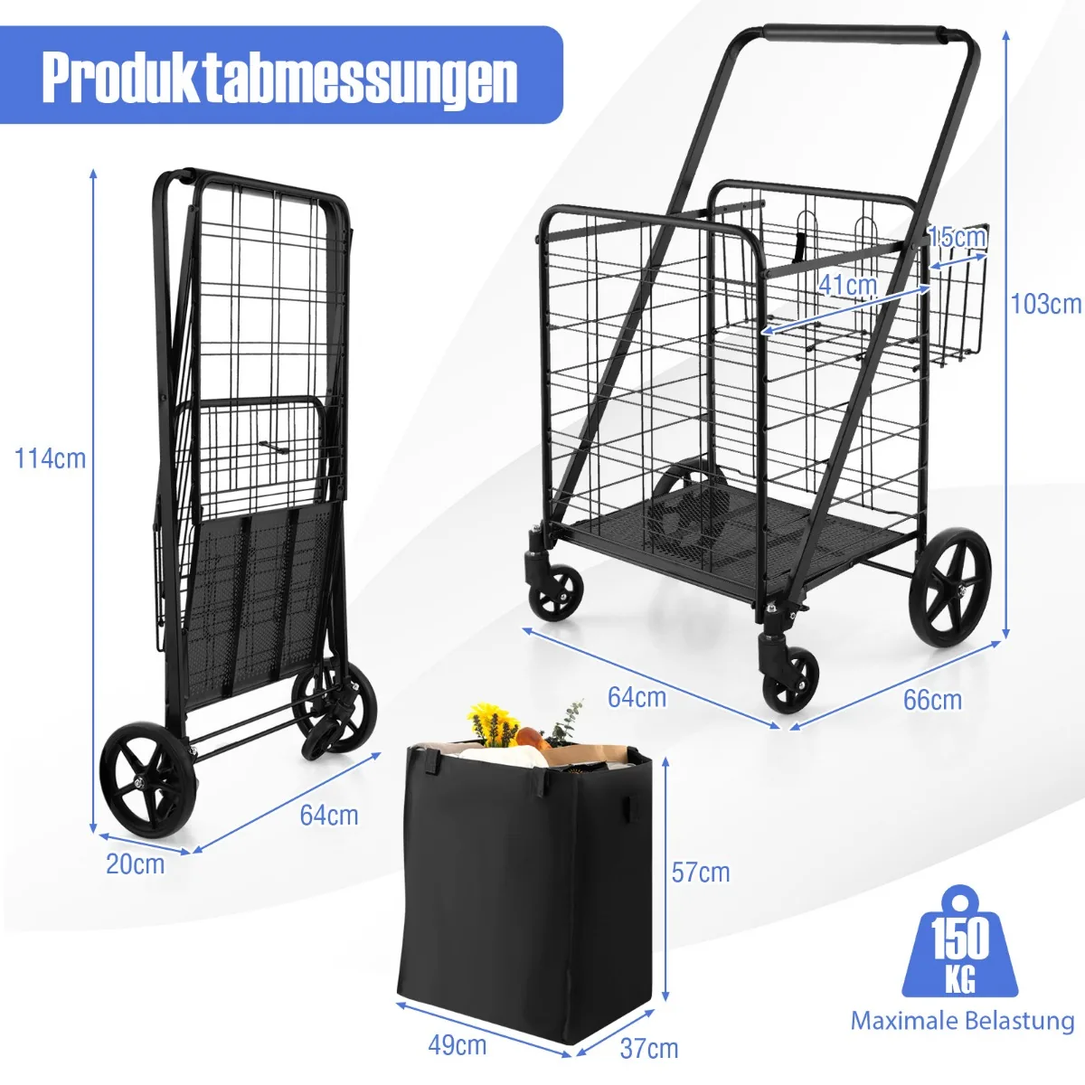 Pirkinių vežimėlis 66x64x103cm, juodos spalvos yra praktiškas sprendimas sunkių prekių gabenimui. Vežimėlis turi didelį krepšelį ir papildomą skyrių, todėl tinka įvairioms saugojimo reikmėms. Kompaktiškai sulankstomas metalinis rėmas ir reguliuojami ratai leidžia lengvai manevruoti bei taupyti vietą namuose ar automobilyje.