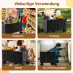 Pirkinių vežimėlis 85x50x102cm juodos spalvos – praktiškas sprendimas kasdieniam apsipirkimui ir transportavimui. Sulankstomas dizainas bei daugiafunkcis naudojimas leidžia patogiai vežti įvairius daiktus tiek mieste, tiek lauke. Vežimėlis turi erdvią dvigubą dėžę, reguliuojamą rankeną ir penkis universalios ratukus, užtikrinančius manevringumą.