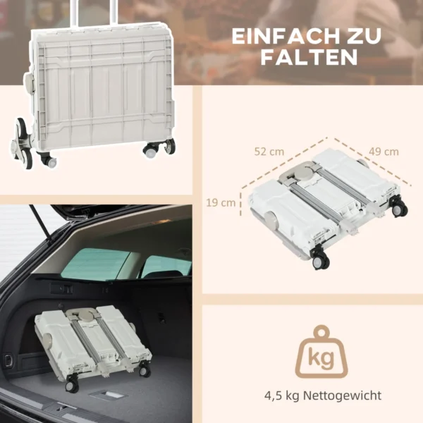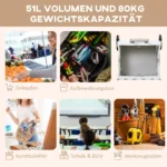 Sulankstomas pirkinių krepšelis HOMCOM su laipiojimo ratukais ir reguliuojama teleskopine rankena yra praktiškas įrankis daiktams gabenti. Jis idealiai tinka apsipirkti, biure, mokykloje ar sandėlyje, taip pat gali būti naudojamas kaip stalas ar sėdimoji dalis, jei reikia. Dėl savo lengvos konstrukcijos ir didelės 80 kg keliamosios galios pirkinių vežimėlis yra idealus jūsų apsipirkimo kelionių kompanionas.