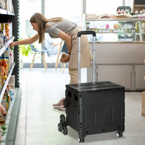Sulankstomas pirkinių krepšelis HOMCOM su laipiojimo ratukais ir reguliuojama teleskopine rankena yra praktiškas įrankis daiktams gabenti. Jis idealiai tinka apsipirkti, biure, mokykloje ar sandėlyje, taip pat gali būti naudojamas kaip stalas ar sėdimoji dalis, jei reikia. Dėl savo lengvos konstrukcijos ir didelės 80 kg keliamosios galios pirkinių vežimėlis yra idealus jūsų apsipirkimo kelionių kompanionas.