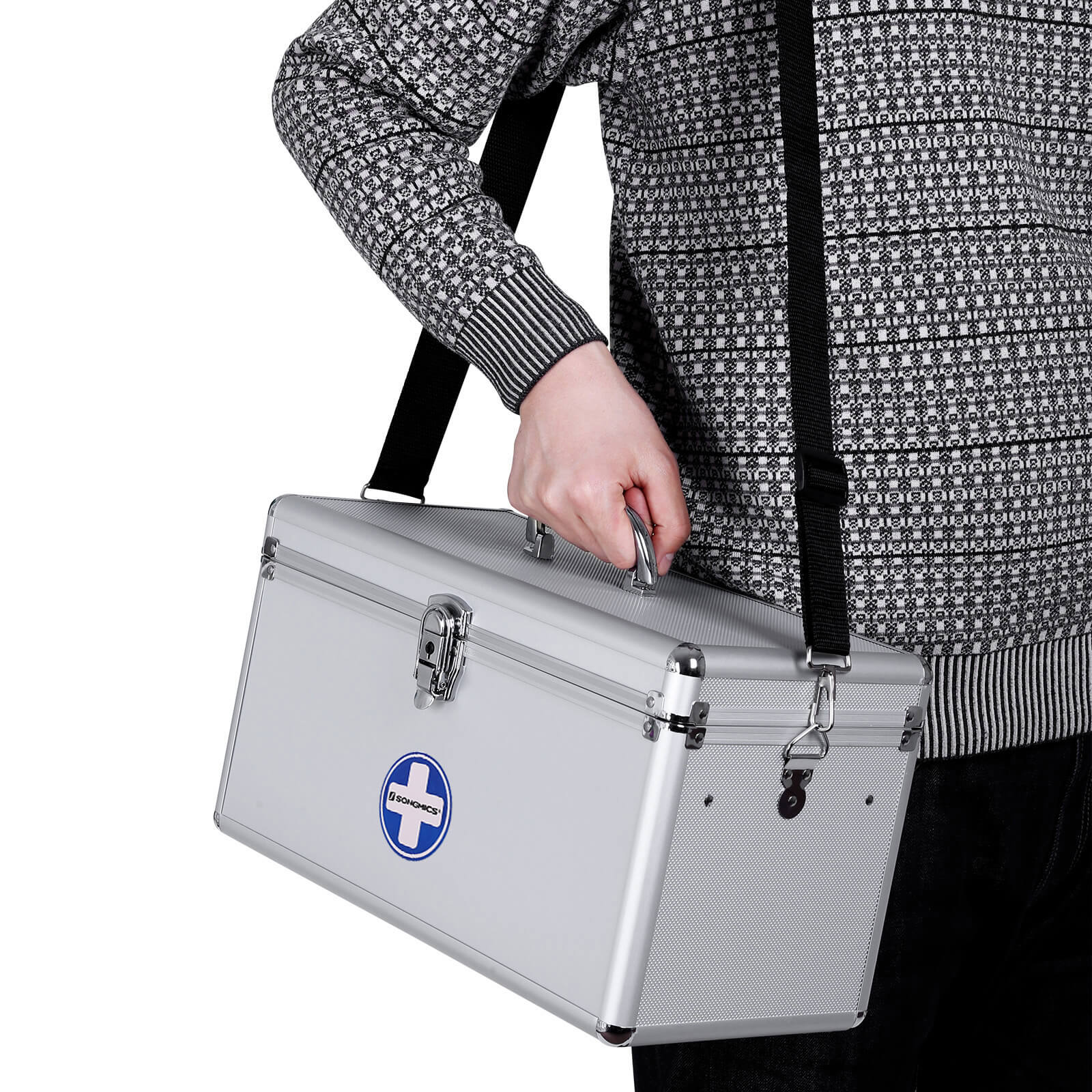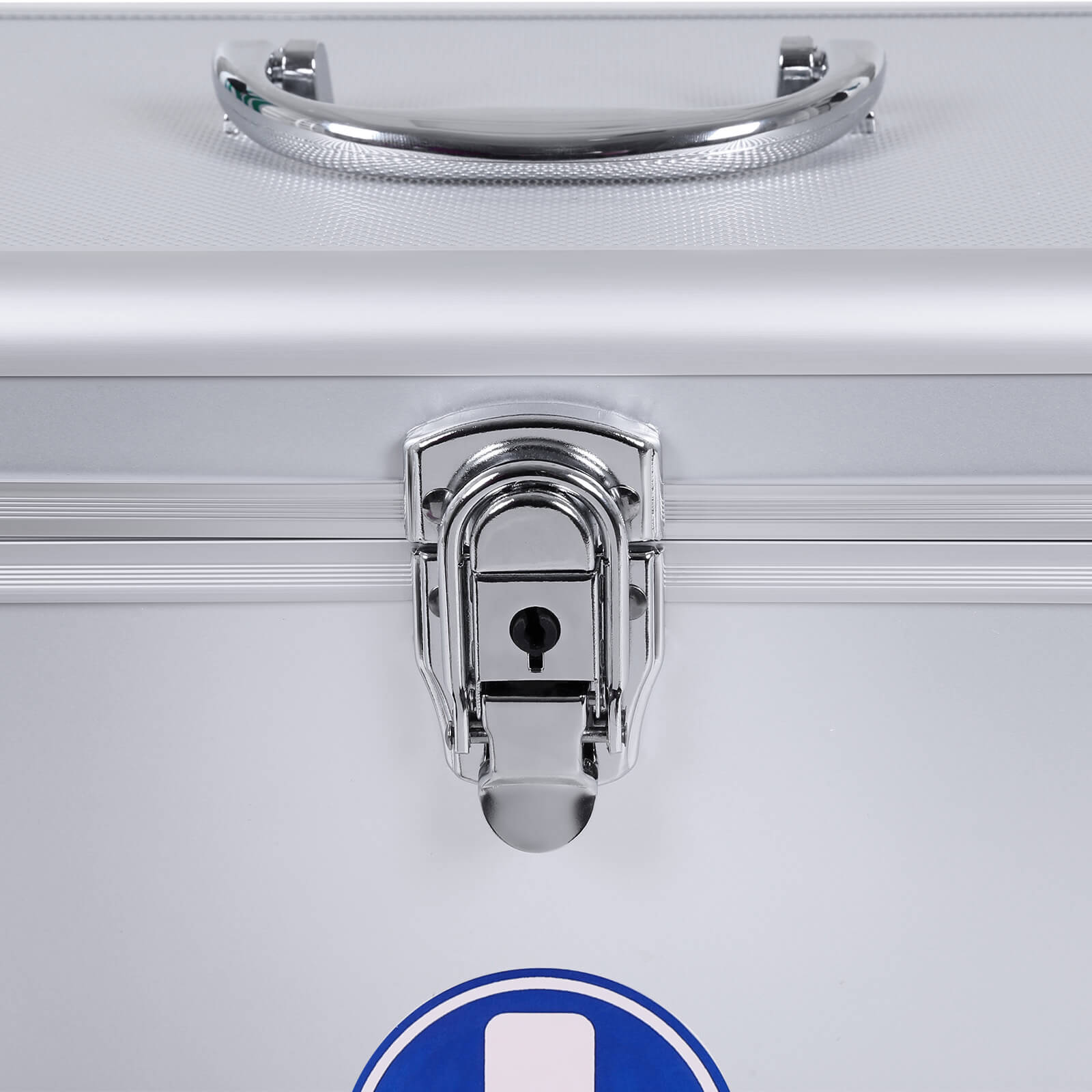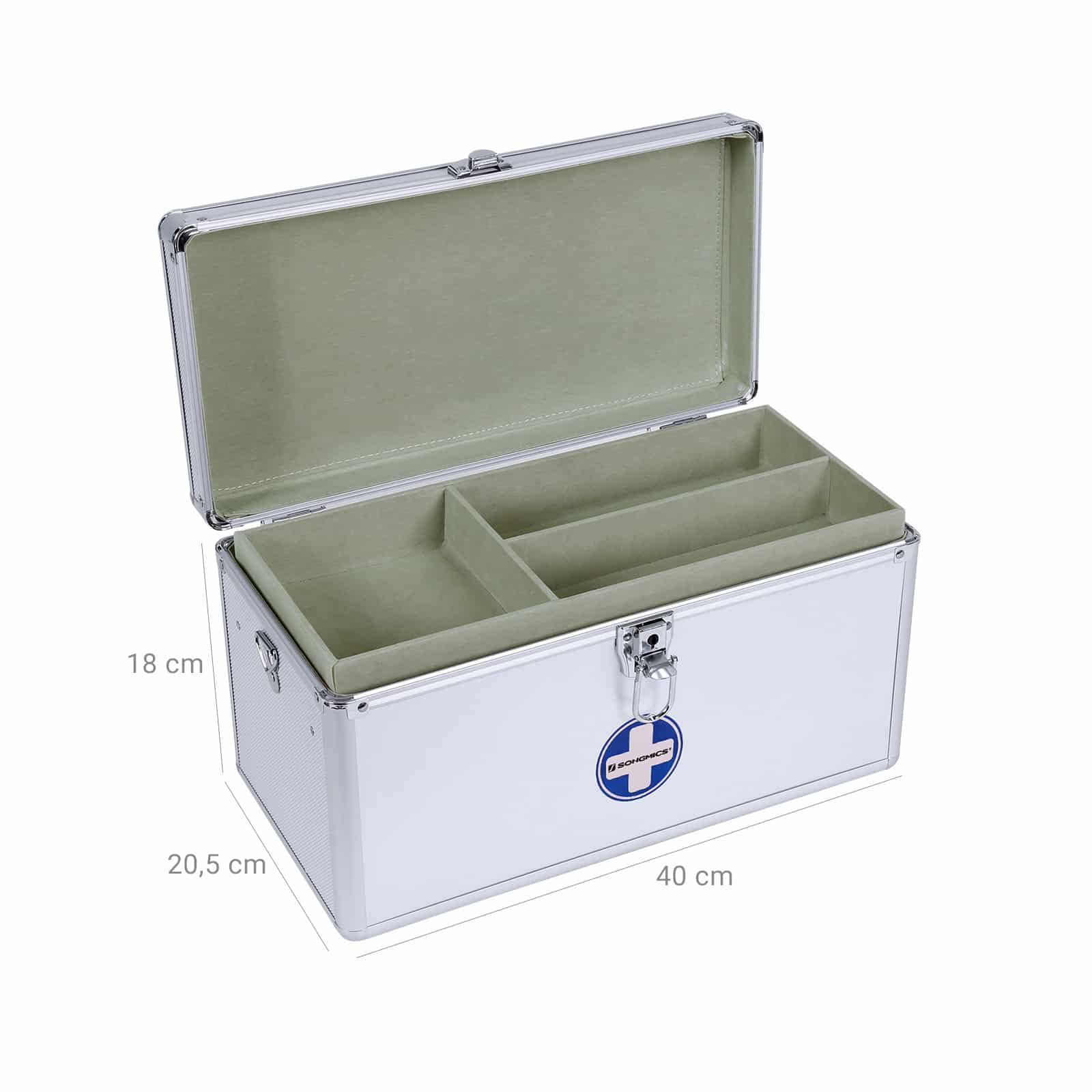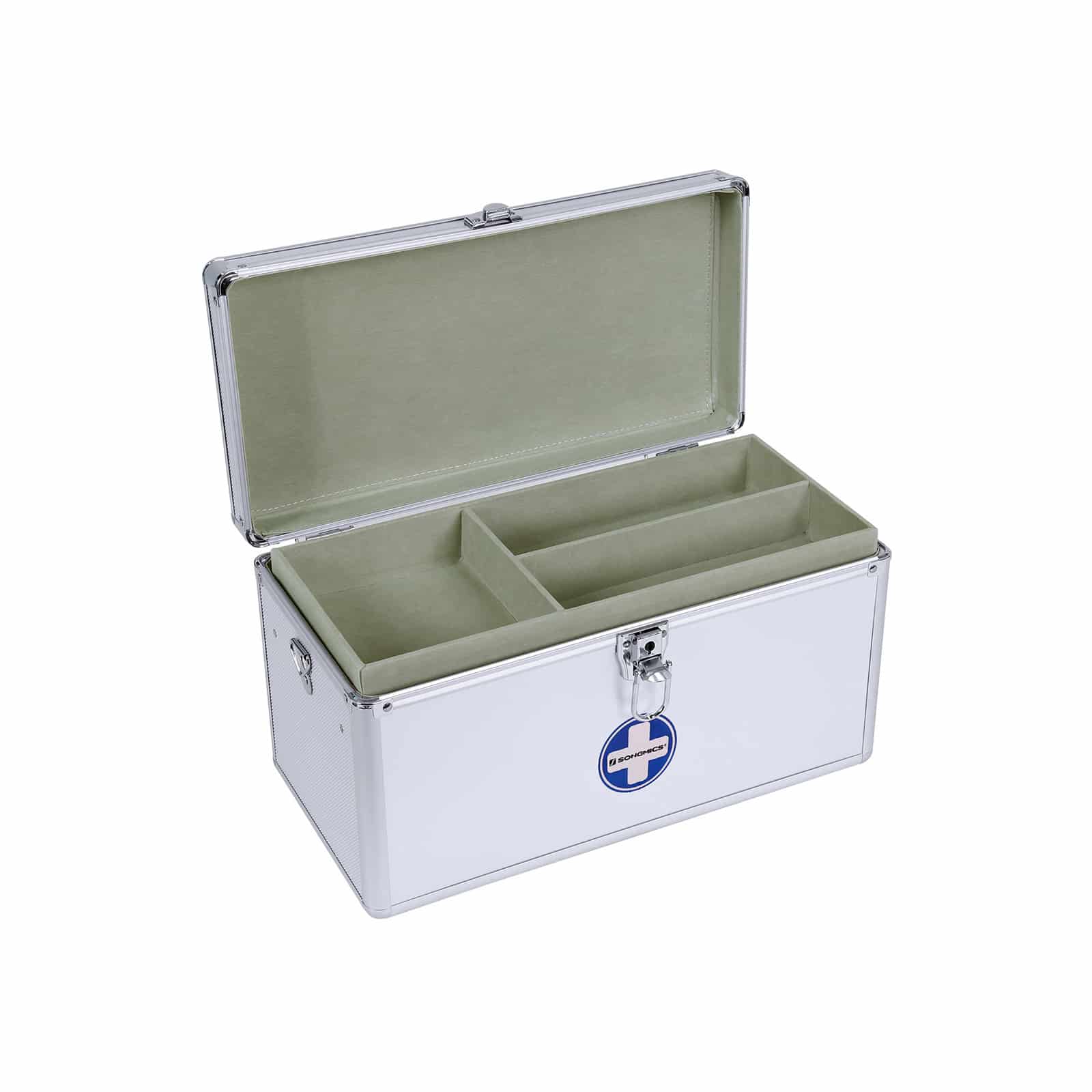 Ši madinga pirmosios pagalbos dėžutė yra atspari smūgiams ir nedūžtama, todėl vaistinė visada yra po ranka. Dėl elegantiškos ir akį traukiančios išvaizdos ji tikrai traukia akį! Erdvioje dėžutėje yra daug vietos dėl 2 lygių ir kelių padalintų skyrių pirmame lygyje. Joje galima sutalpinti įvairiausius žaizdų priežiūros produktus (tvarsčius, kompresus, pleistrus) ir įprastus vaistus. Viskas tvarkinga ir visada po ranka.