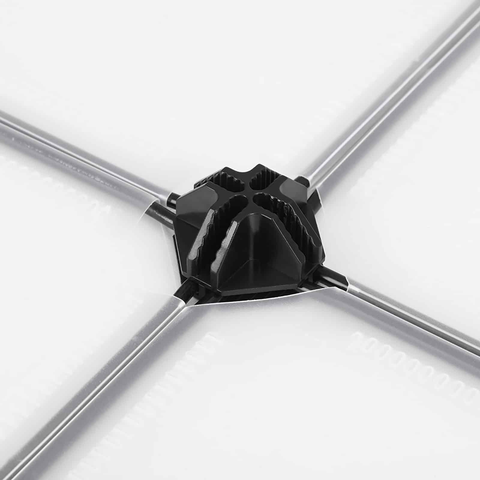 Besiūlis dizainas su 4 metalinio rėmo kampais leidžia ypač glaudžiai sujungti jungiamąsias dalis ir plokštes, todėl dulkės ar vabzdžiai čia netelpa.